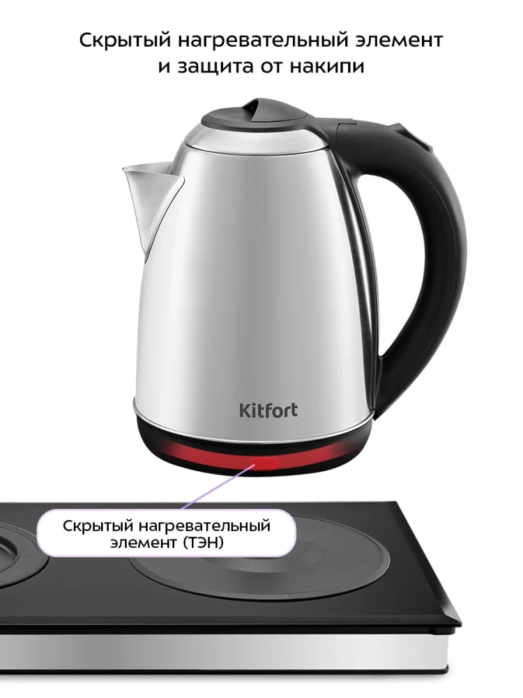 Нагревательный элемент (ТЭН) у чайника скрытый и находится в донной части. Сверху он закрыт специальной металлической пластиной из нержавеющей стали, благодаря которой исключается прямой контакт ТЭНа с водой. Такая конструкция препятствует образованию накипи, облегчает уход и снижает шум при нагревании воды.