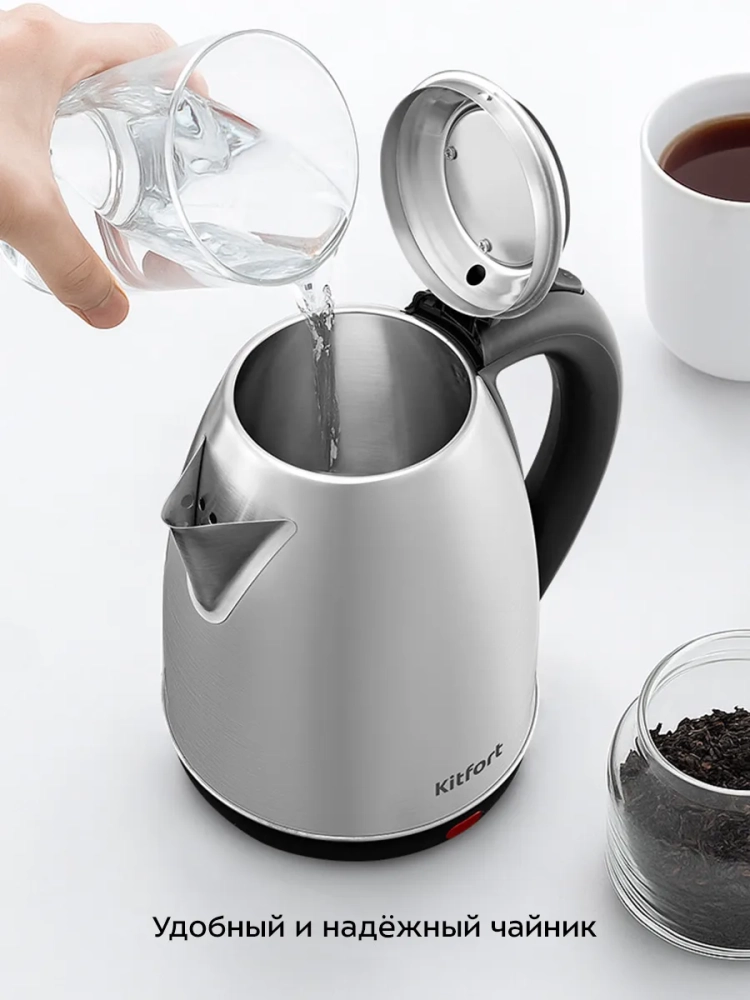 Корпус чайника выполнен из нержавеющей стали. Крышка чайника выполнена из нержавеющей стали и пластика. Ручка чайника пластиковая, что позволяет комфортно и удобно держать чайник в руке. Переключатель расположен на ручке. На внутренней стороне чайника нанесены максимальная и минимальная отметки.