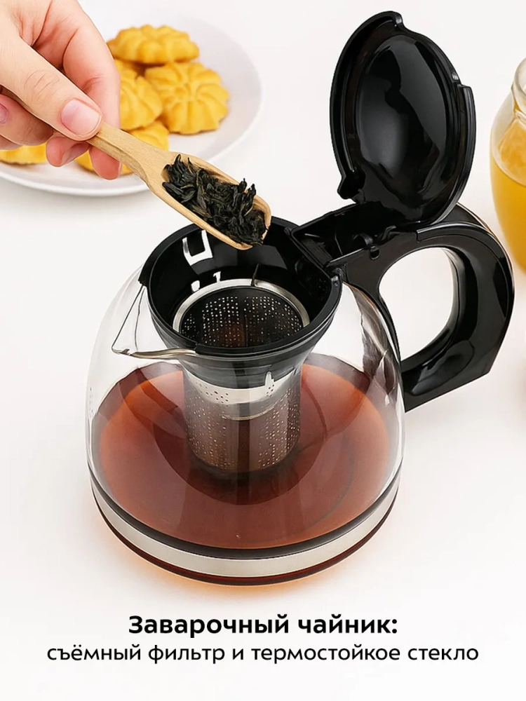 Заварочный чайник изготовлен из термостойкого стекла и имеет съемный фильтр для чая или кофе. Крышка и ручка заварочного чайника выполнены из пластика, фильтр — из нержавеющей стали. В месте установки заварочного чайника на базу находится платформа с подогревом, благодаря которой вы можете сохранить готовый напиток теплым.