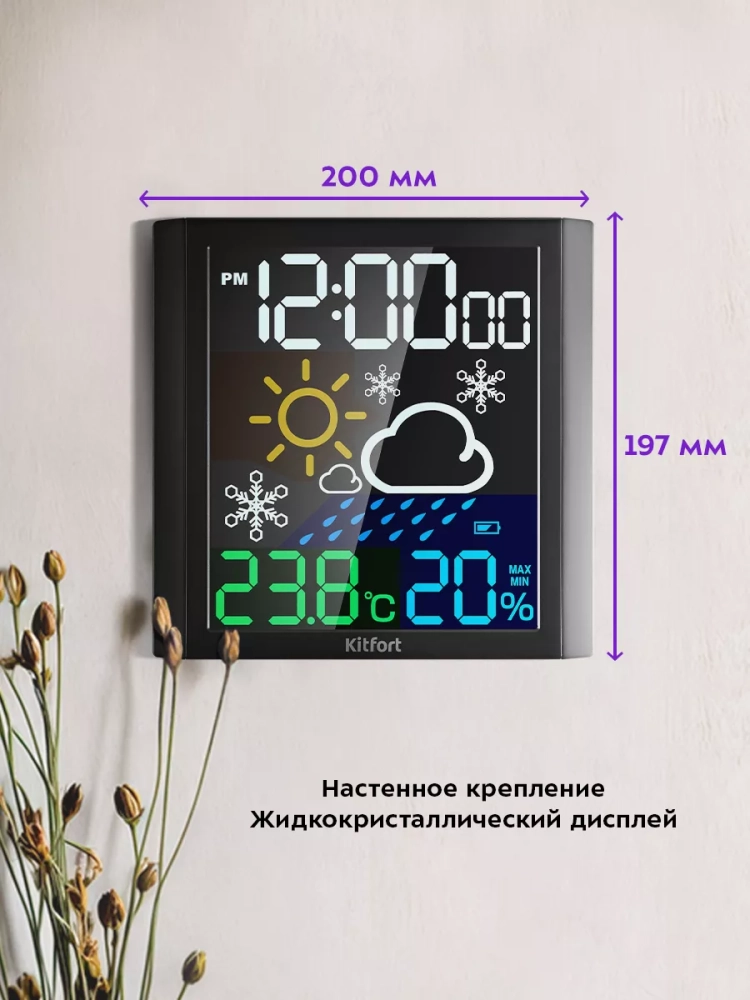 Часы с термометром и гигрометром Kitfort KT-3385 выполняют сразу несколько функций: показывают время, температуру и уровень влажности в помещении, а также дают прогноз погоды. Устройство прогнозирует погодные условия на основе изменения температуры и влажности. Температура отображается в градусах Цельсия.