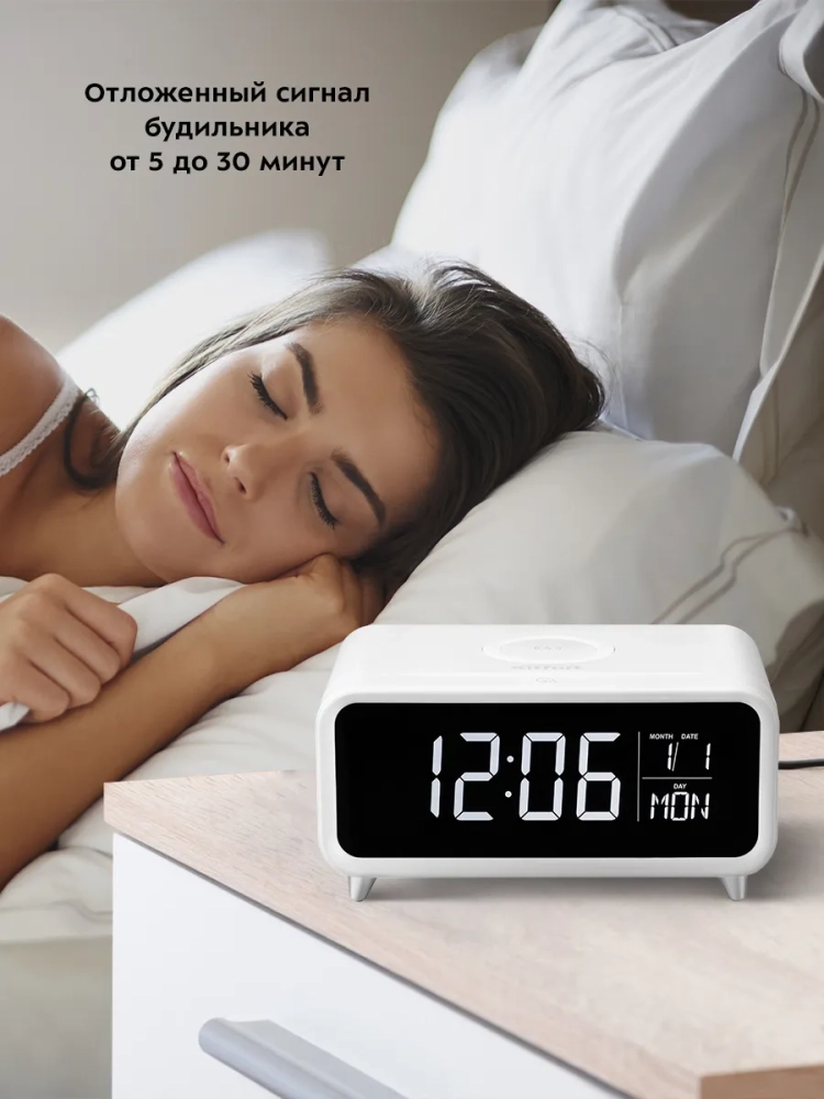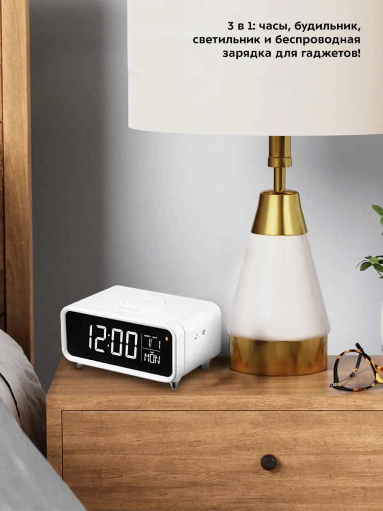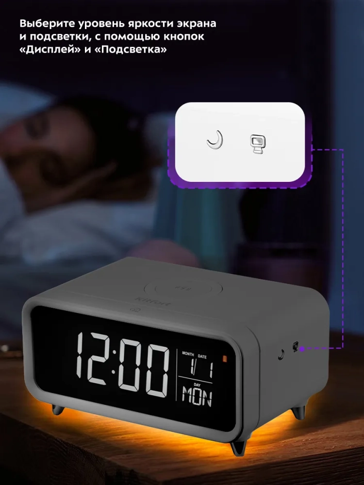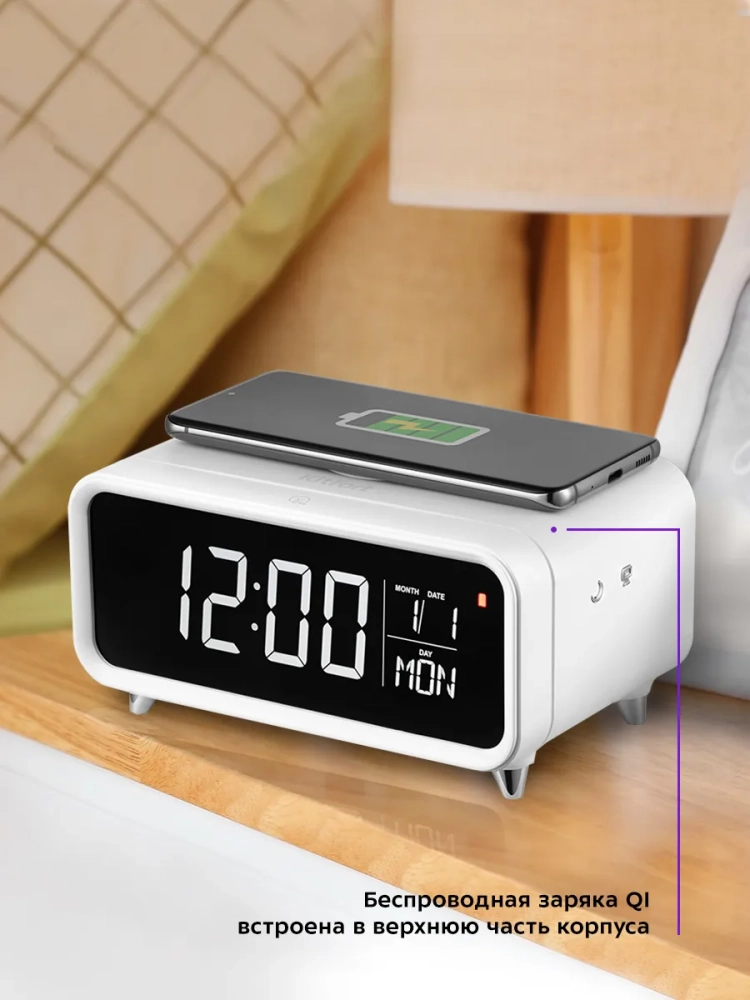 Настольные часы Китфорт KT-3308 выполняют сразу несколько функций: показывают время, дату и день недели, могут служить будильником и светильником. Благодаря беспроводной зарядке, встроенной в верхнюю часть корпуса, вы можете заряжать телефон, часы или другие устройства, если они поддерживают функцию беспроводной зарядки. Яркость дисплея и подсветки настраивается, что очень удобно. Также подсветку и дисплей можно отключить. Благодаря стильному дизайну и компактному размеру настольные часы легко впишутся в ваш интерьер. На настольных часах вы можете установить будильник. Сигнал будильника можно отложить или отключить. Время отложенного сигнала можно настроить от 5 до 30 минут с шагом 5 минут. Внутри отсека для батареек установлена резервная батарейка типа CR2032, чтобы при отключении от источника питания настройки не сбивались. Резервная батарейка нужна только для сохранения настроек, настольные часы не будут работать без подключения к источнику питания.
