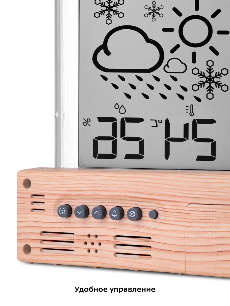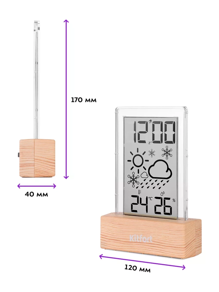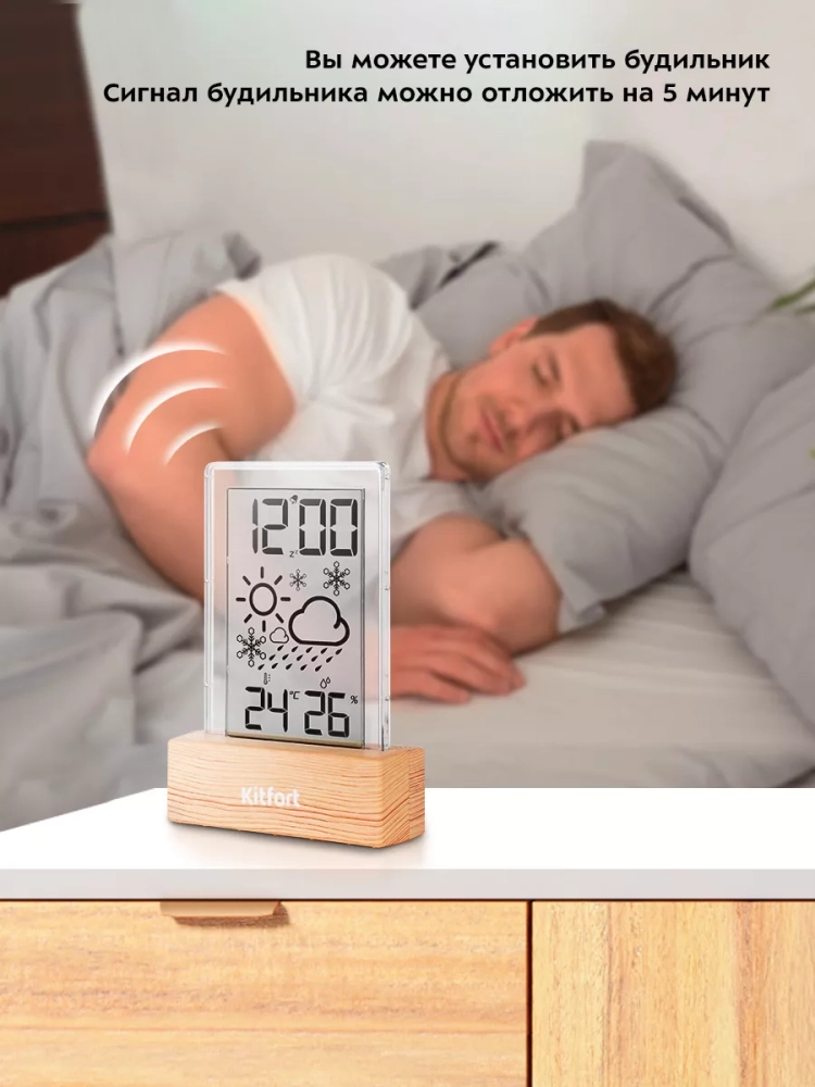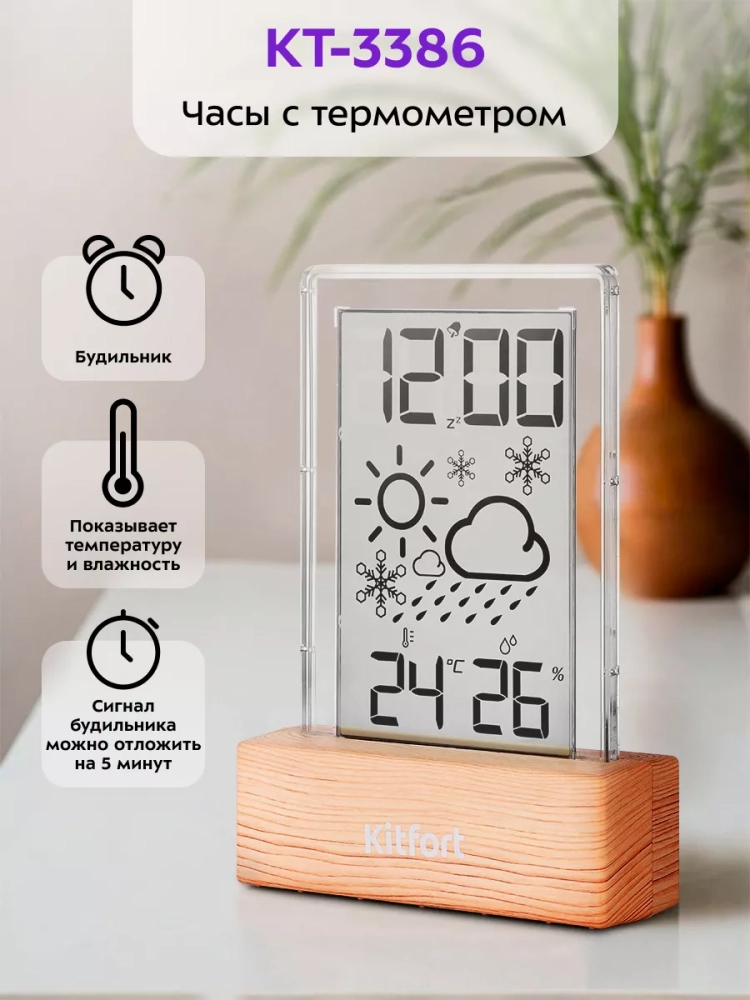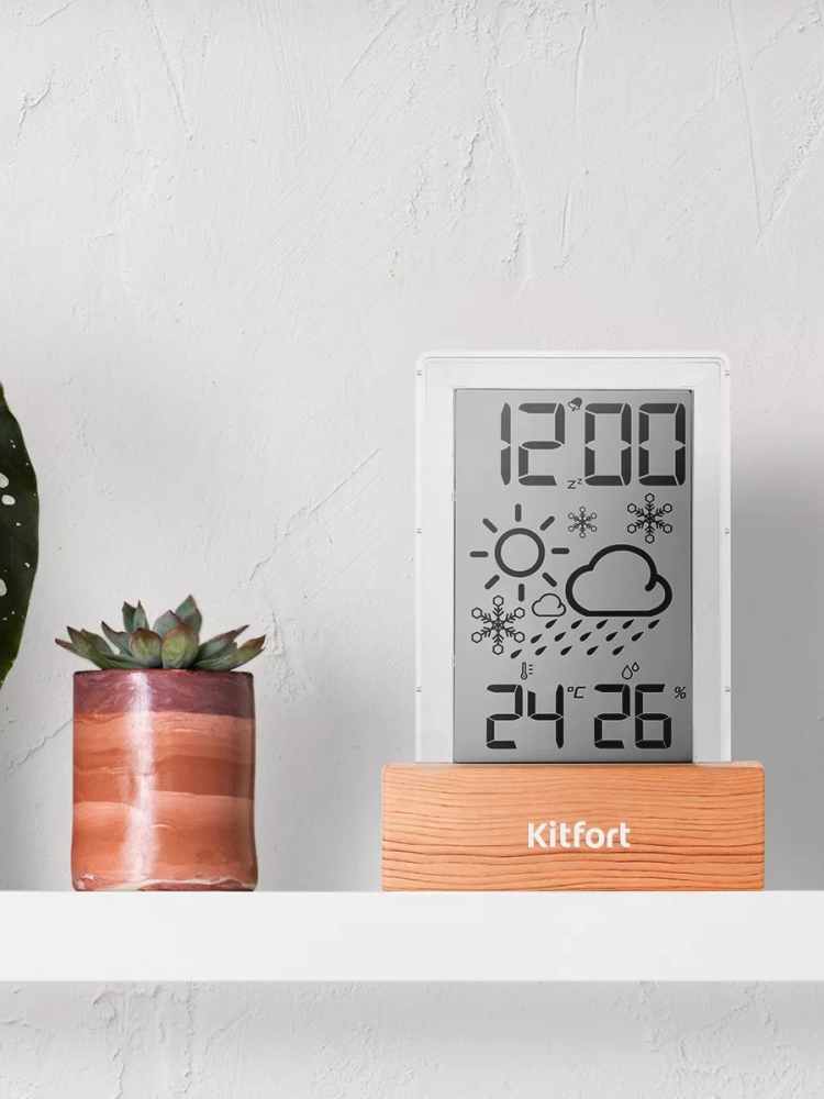 Часы с термометром и гигрометром Kitfort KT-3386 выполняют сразу несколько функций: показывают время, температуру и уровень влажности в помещении, а также дают прогноз погоды. Устройство прогнозирует погодные условия на основе изменения температуры и влажности. Температура отображается в градусах Цельсия. Вы можете установить будильник. Сигнал будильника можно отложить на 5 минут. Часы работают от 1 батарейки типа CR2032 (не входит в комплект), благодаря чему их можно расположить в любом удобном для вас месте. Благодаря стильному дизайну и компактному размеру часы легко впишутся в ваш интерьер. Диапазон измерения температуры: от -20 *С до +50 *С. Диапазоны измерения влажности: 20-99%