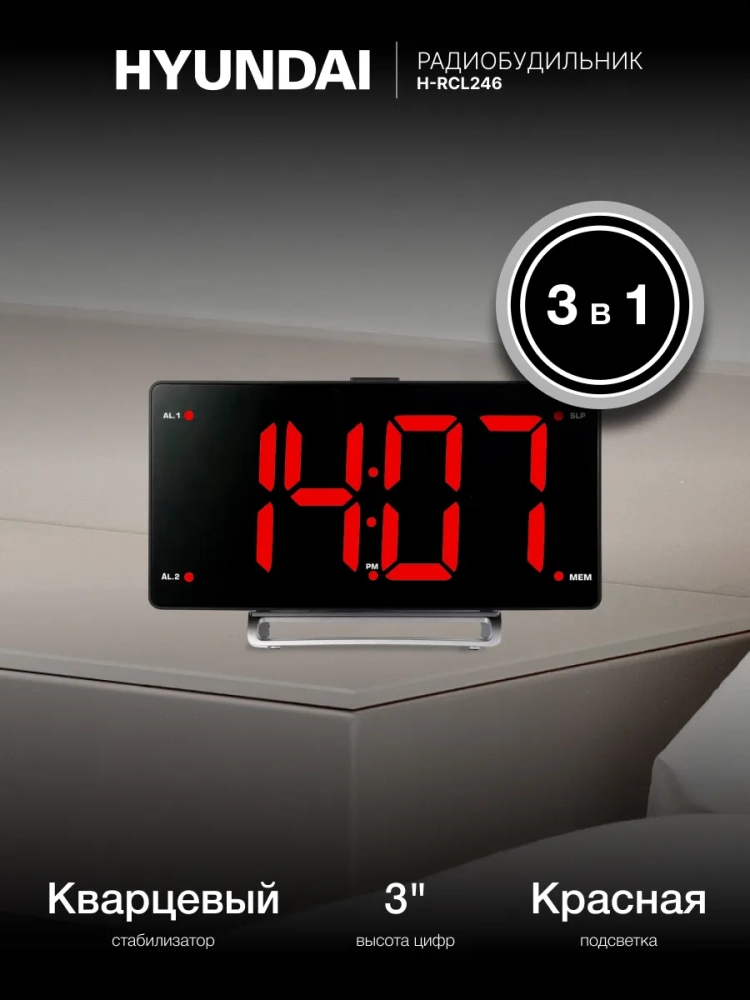 Hyundai H-RCL246 - настольный будильник, который обладает яркой подсветкой, позволяющей легко видеть время даже в темноте. Он оснащен функцией радиоприемника, благодаря которой вы сможете настроить свою любимую радиостанцию и наслаждаться ее звуком каждое утро.