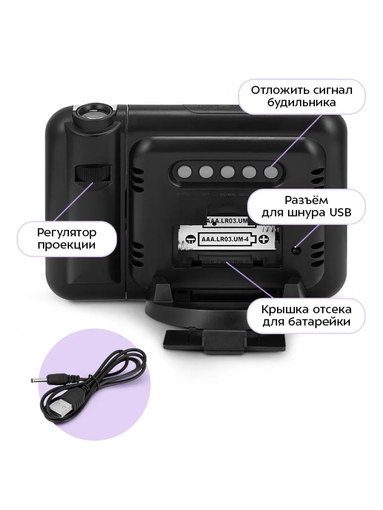 Часы работают при подключении к источнику питания при помощи шнура USB или от 2 батареек типа ААА (не входят в комплект). При питании от батареек часы можно расположить в любом удобном для вас месте, но при этом подсветка дисплея и проекция будут отключены. Нажатием на кнопку их можно включить, через 8 секунд дисплей и проекция снова погаснут.