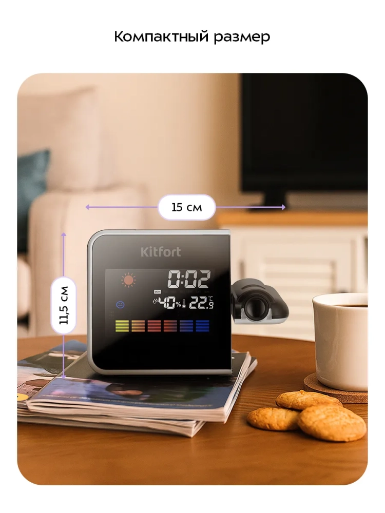 Часы с термометром и гигрометром Kitfort KT-3726 выполняют сразу несколько функций: показывают время, число, месяц и день недели, температуру и уровень влажности в помещении, диаграмму изменения температуры, максимальные и минимальные показания влажности и температуры за сутки, а также дают прогноз погоды. Устройство прогнозирует погодные условия на основе показаний влажности. На основании показаний влажности и температуры устройство отображает соответствующий индикатор самочувствия. Комфортный микроклимат в помещении очень важен для человека, так как влияет на самочувствие, настроение и работоспособность.