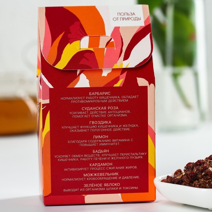 Состав: барбарис, гибискус, гвоздика, лимон, зелёное яблоко, кардамон, можжевельник.