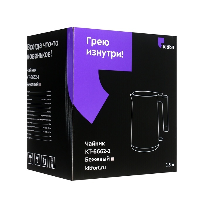 Чайник электрический Kitfort КТ-6662-1, пластик, колба металл, 1.5 л, 2200 Вт, бежевый