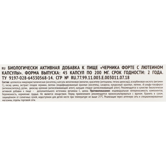 Состав: целлюлоза микрокристаллическая (носитель), капсула желатиновая (желатин, красители (антоцианы, титана диоксид)), аскорбиновая кислота (витамин С), оксид цинка, экстракт плодов черники, лютеин 10%, рутин, диоксид кремния (антислеживающий агент), кальция стеарат (антислеживающий агент).
