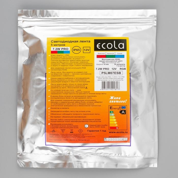 Cветодиодная лента Ecola PRO 5 м, IP65, SMD5050, 30 LED/м, 7.2 Вт/м, 12 В, RGB
