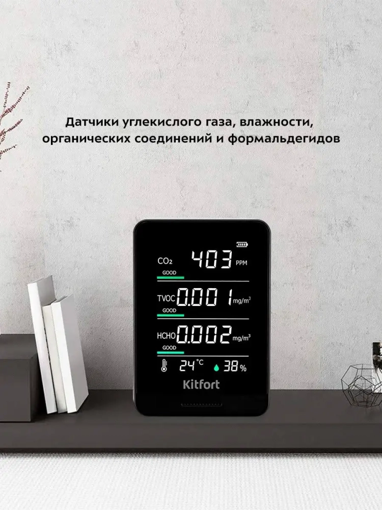 Датчик Kitfort CO2 — это прибор, который измеряет концентрацию углекислого газа в помещении и сообщает о необходимости проветривания комнаты, ведь именно избыточное содержание углекислого газа в помещении приводит к духоте и затхлому воздуху. При повышенном уровне углекислого газа в помещении повышается его концентрация в крови человека. Это приводит к нарушению работоспособности всего организма. Датчик CO2 подскажет, когда нужно открыть окно и проветрить помещение, чтобы снизить содержание углекислого газа в помещении.