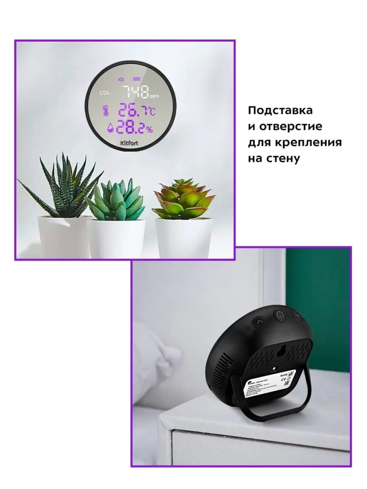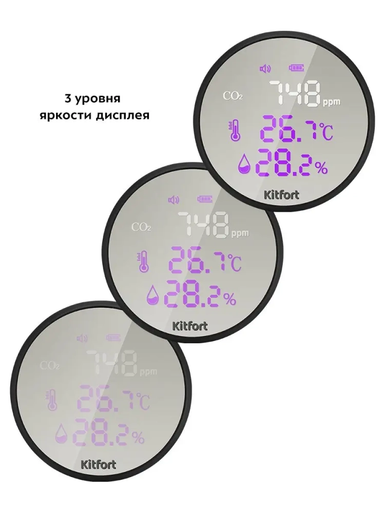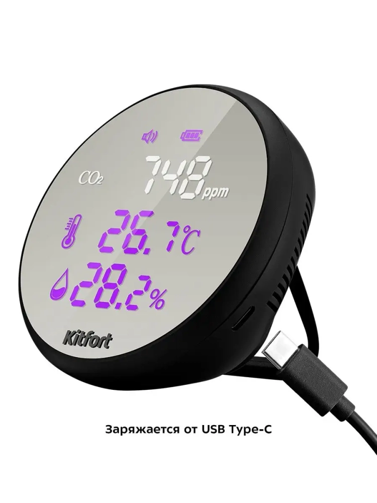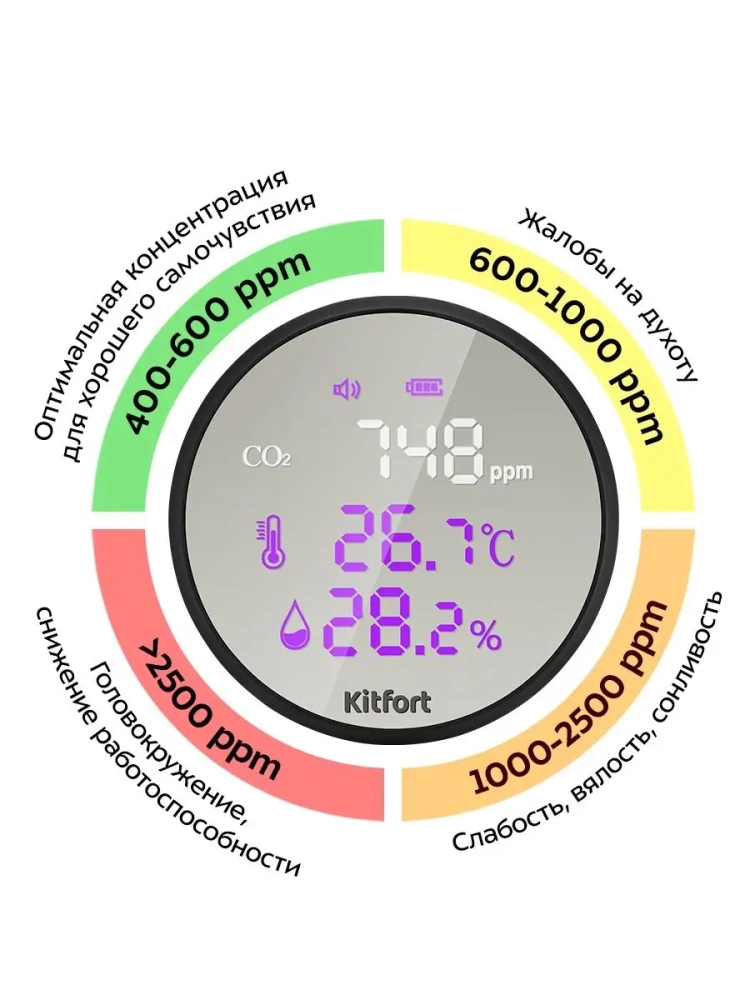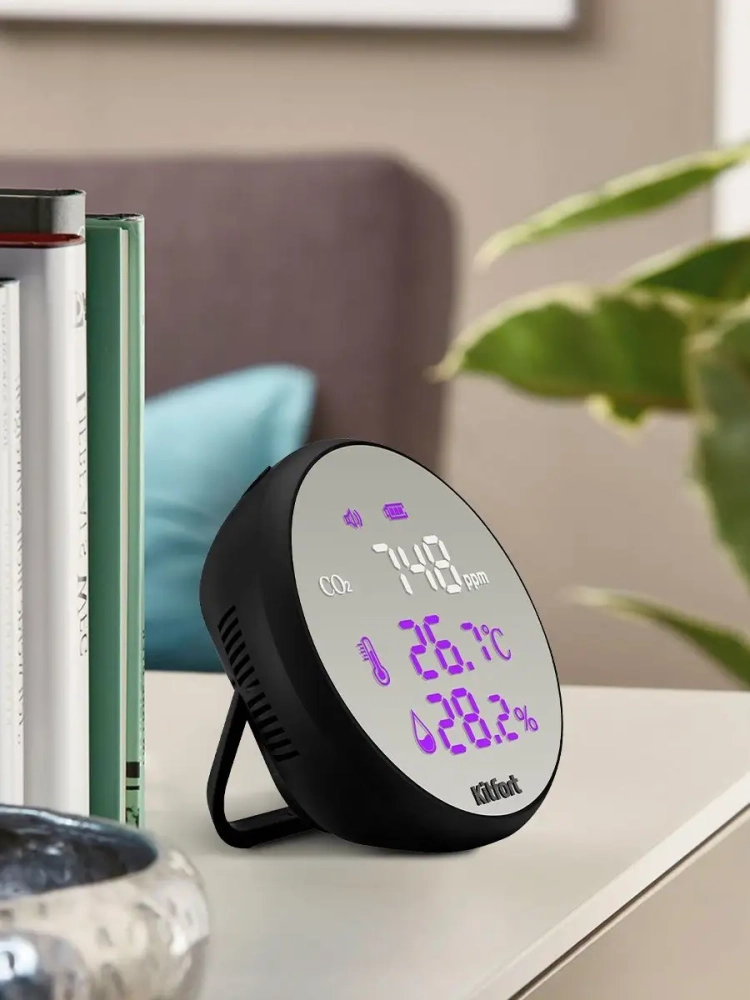 Датчик Kitfort CO2 — это прибор, который измеряет концентрацию углекислого газа в помещении, ведь именно избыточное содержание углекислого газа в помещении приводит к духоте и затхлому воздуху. При повышенном уровне углекислого газа в помещении повышается его концентрация в крови человека. Это приводит к нарушению работоспособности всего организма. Датчик CO2 подскажет, когда нужно открыть окно и проветрить помещение, чтобы снизить содержание углекислого газа в помещении.