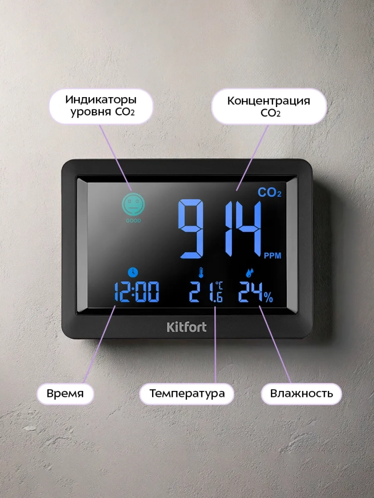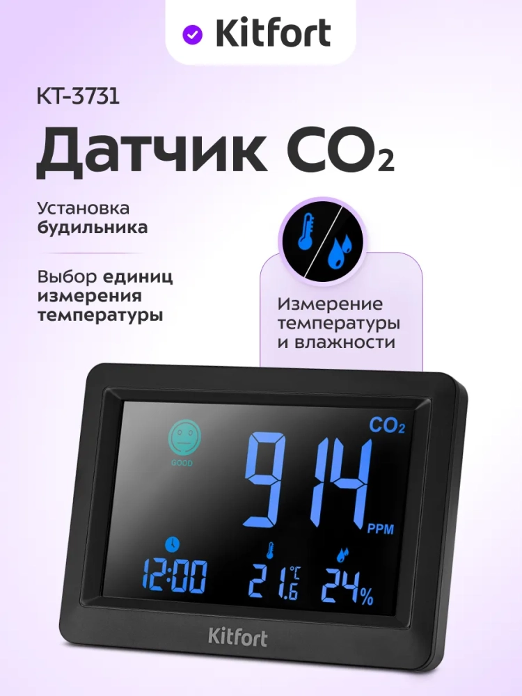 Датчик CO2 Kitfort КТ-3731 — это прибор, который измеряет концентрацию углекислого газа в помещении, а также показывает время, температуру и влажность воздуха. Избыточное содержание углекислого газа приводит к духоте и ухудшению самочувствия. При повышенном уровне углекислого газа в помещении повышается его концентрация в крови человека. Это приводит к нарушению работоспособности всего организма. Чтобы снизить содержание углекислого газа в помещении, необходимо открыть окно и проветрить помещение, и датчик CO2 подскажет, когда это нужно сделать.