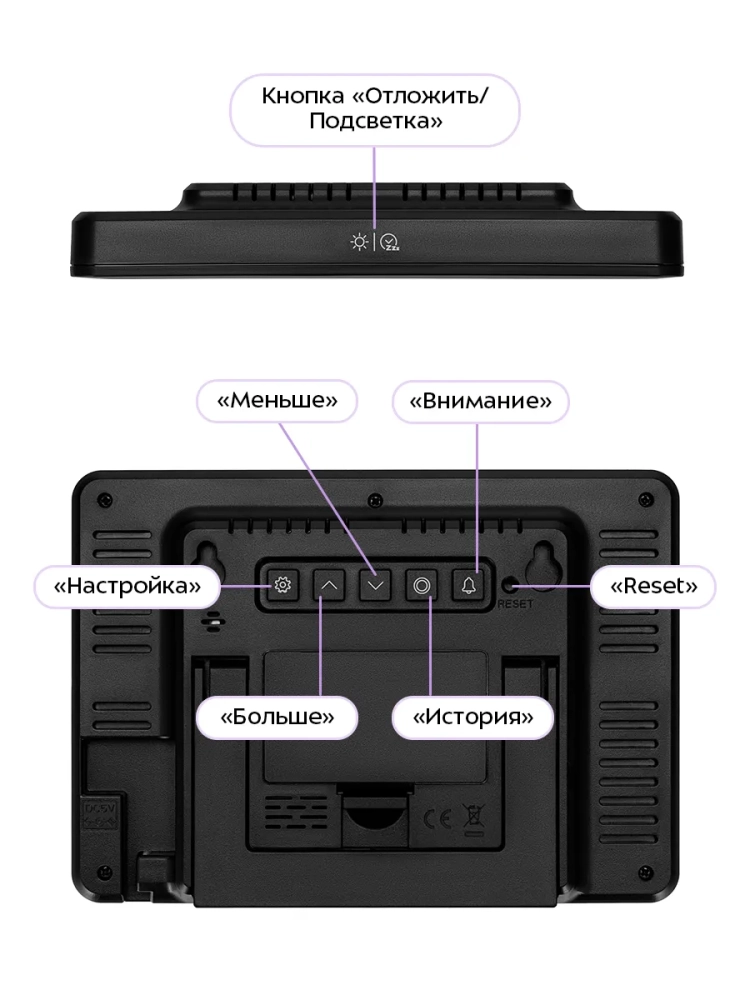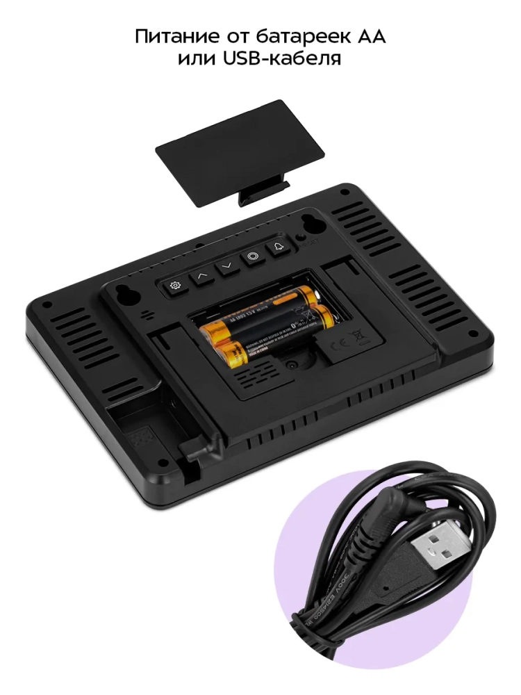 Датчик СО2 работает от USB-шнура (входит в комплект) или от 2 батареек типа АА (не входят в комплект). Чтобы отслеживать концентрацию углекислого газа в воздухе, подключите устройство к источнику питания через USB-шнур. При питании от батареек устройство становится часами с термометром и гигрометром: концентрация СО2 в воздухе рассчитана не будет, на дисплее будут отображаться только время, температура и влажность.