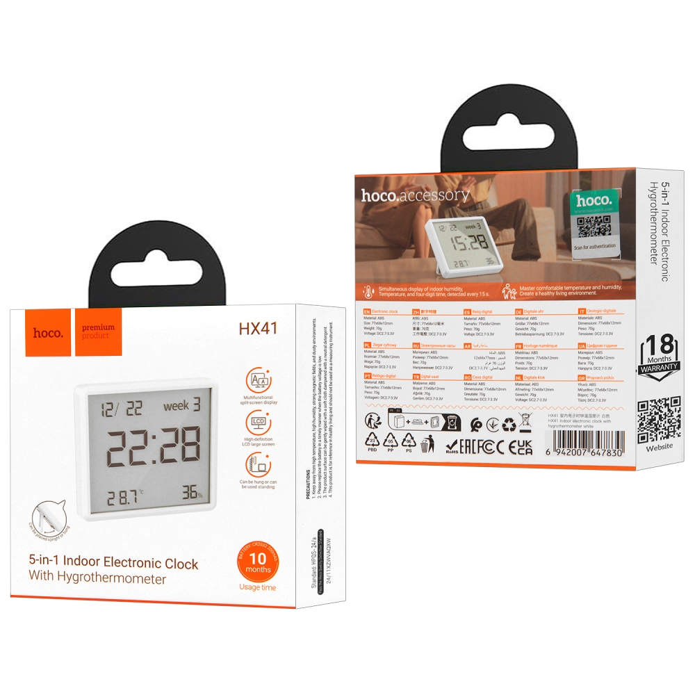 Датчик температуры и влажности HX41 с часами 5 в1 Indoor гигротермометр белый Hoco