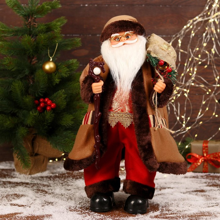 Дед Мороз "В коричневой шубке, с посохом" двигается, 20х50 см