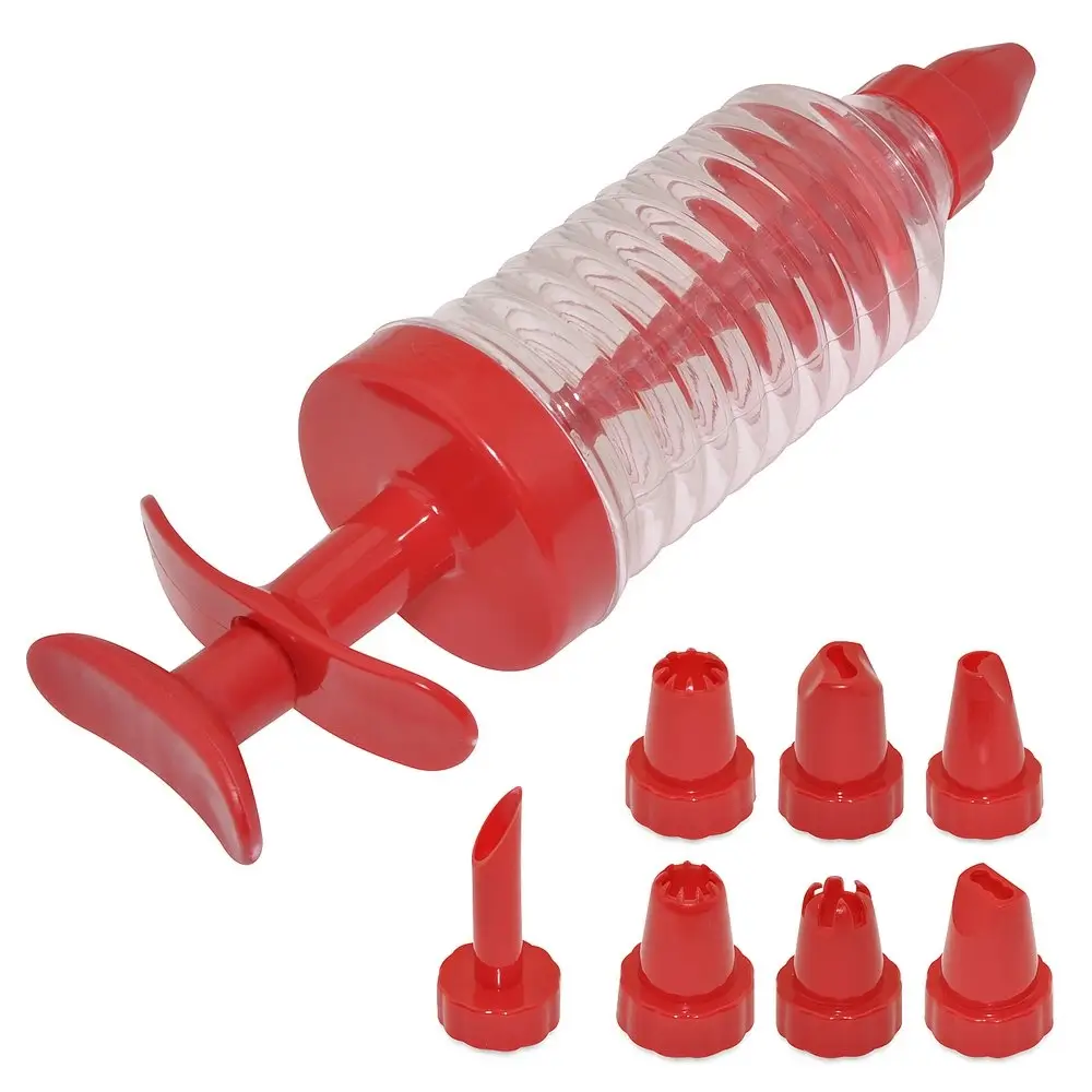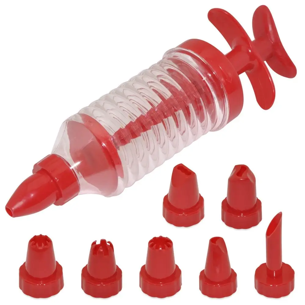Украшайте домашнюю выпечку оригинальными кремовыми композициями с декоратором для крема с насадками. Набор состоит из специального шприца и 8 насадок. Наличие разных прорезей позволяет создавать разнообразное оформление из крема. Набор изготовлен из пластмассы (полистирол, полипропилен), этот материал полностью безопасен, за ним легко ухаживать. После использования мойте декоратор водой с моющими средствами. Объем 100 мл.