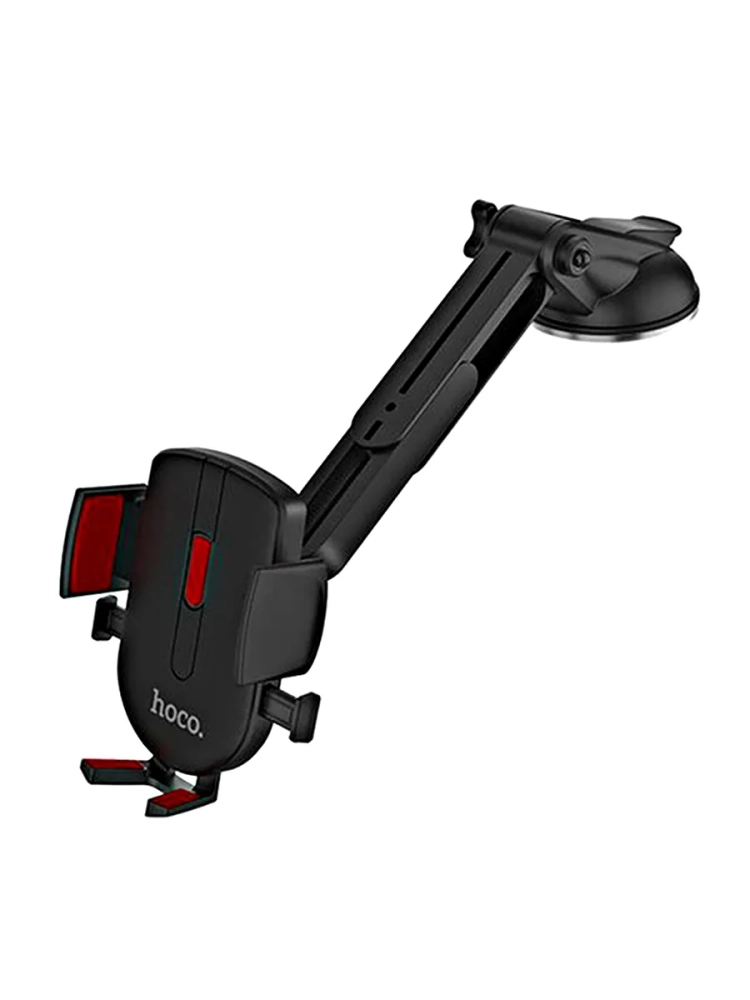Держатель автомобильный HOCO CAD01 изготовлен из качественного, прочного пластика с элементами из силикона. Крепится на панель приборов автомобиля, боковое или лобовое стекло с помощью вакуумной присоски. Платформа держателя соединена с основанием с помощью шаровой головки, благодаря которой смартфон можно вращать на 360°. Кроме этого, здесь имеется поворотная штанга, которая может поднимать или опускать гаджет, а также изменять расстояние между вами и смартфоном.
