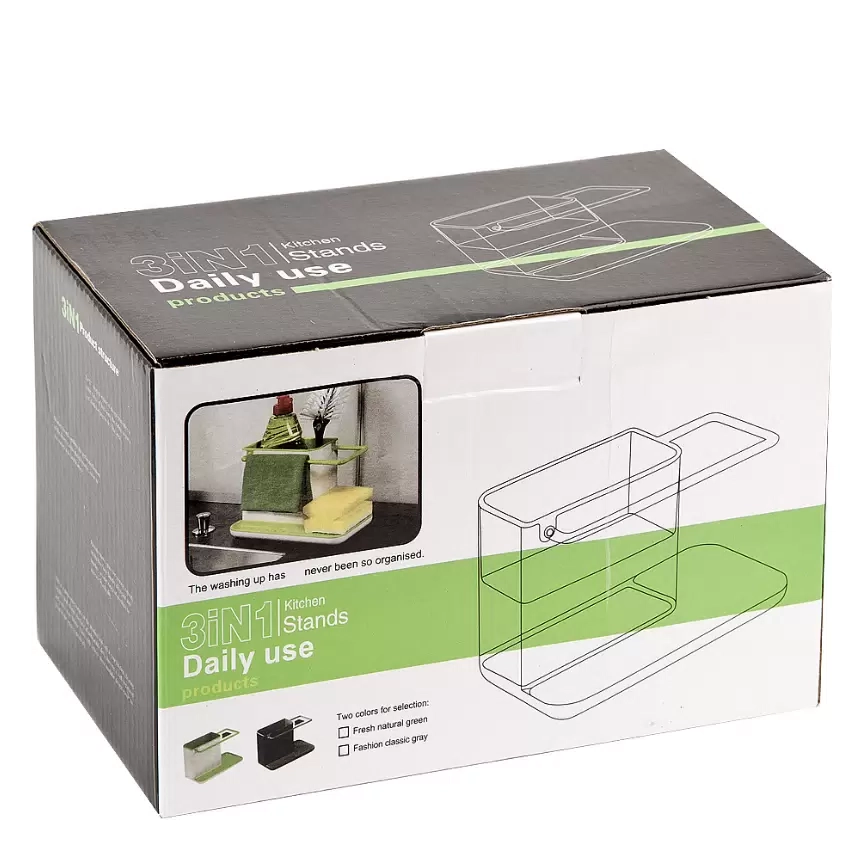 Это универсальный органайзер для кухонной раковины «Daily use 3 in 1», он позволяет сэкономить много места возле раковины на кухне, что позволяет сделать уборку более быстрой и качественной. Он не займёт много места и имеет современный дизайн, ввиду чего он подойдёт к любой кухне. Средство для уборки и мытья кухонной посуды теперь не надо прятать в шкафчик. Органайзер имеет специализированный отсек, который позволит разместить часто-используемую химию, а так же ершики и моющие щетки. Стоит отметить, что данный товар имеет специальные отверстия, расположенные в поддоне, что не даст скапливаться воде под губками. Так же для тряпочек предусмотрена вешалка-планка. Органайзер для раковины – гигиеничный вариант хранения моющих принадлежностей! Регулярно разбирайте органайзер, тщательно мойте и просушивайте все его части во избежание образования грибка и закисания воды. Разрешается ручная мойка деталей.