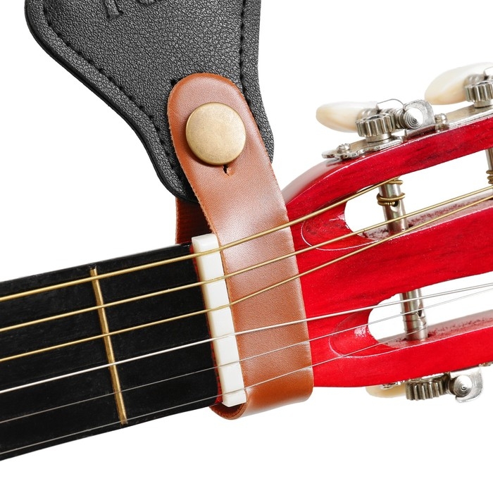 Держатель застегивается на головке грифа сразу над верхним порожком (пропускается под струнами) и крепится к любому гитарному ремню.
