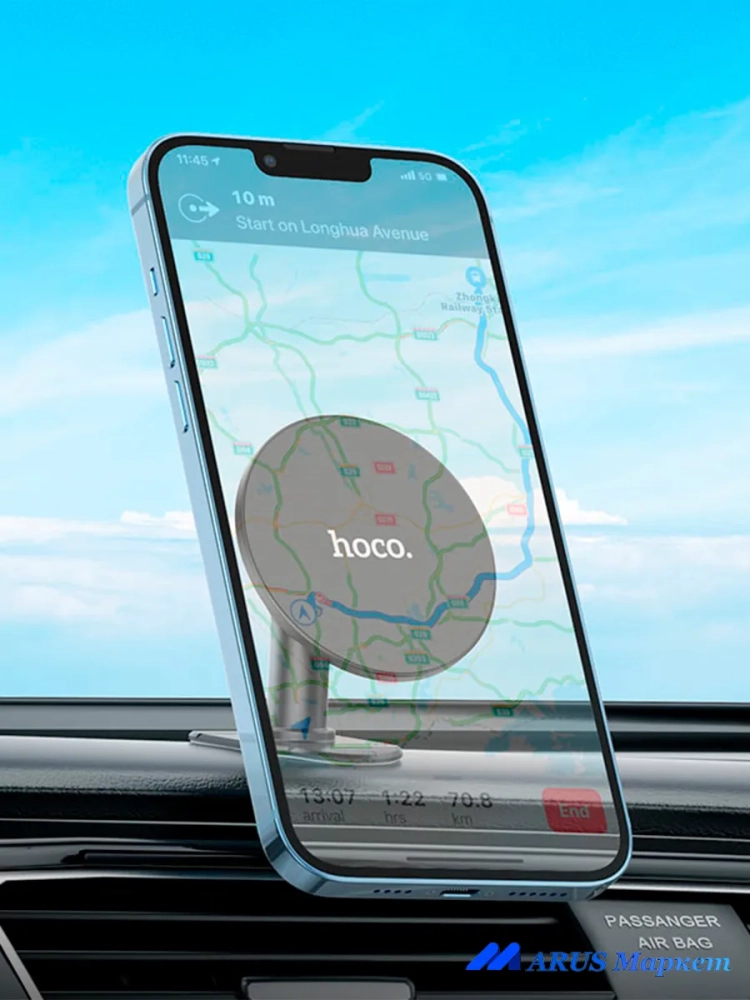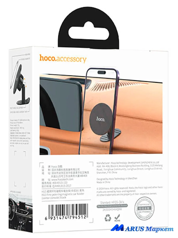 Держатель автомобильный для смартфона и прочих мобильных устройств HOCO H13 на панель, магнитный, черный. Держатель магнитный для смартфона и прочих мобильных устройств HOCO H13 в машину на приборную панель разработан с учетом потребностей современных автомобилистов. Легкое крепление на панель приборов, надежная фиксация устройства и возможность регулировки угла наклона обеспечивают максимальное удобство при использовании. Благодаря надежному магнитному креплению, держатель HOCO H13 совместим практически со всеми автомобильными гаджетами включая смартфоны, GPS-навигаторы, планшеты и другие устройства. Магнитный держатель обеспечивает защиту устройства в процессе езды, не закрывая при этом экран и разъем для подзарядки при креплении на мощный магнит. Держатель HOCO H13 является прочным и долговечным, изготовлен из ABS-пластика, обеспечивает стабильную фиксацию устройства на всем протяжении использования. Никаких сложных креплений: просто поднесите смартфон, и держатель примагнитит и надежно зафиксирует устройство и будет его надежно удерживать даже при большой скорости движения или езде по неровной дороге. Подходит для устройств диаметром 4,5-7 дюймов, весом не более 500 грамм.