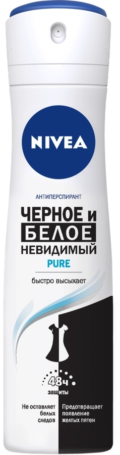 Дезодорант-антиперспирант спрей NIVEA Pure Черное и Белое Невидимая защита предотвращает появление белых пятен на темной и желтых пятен на светлой одежде.