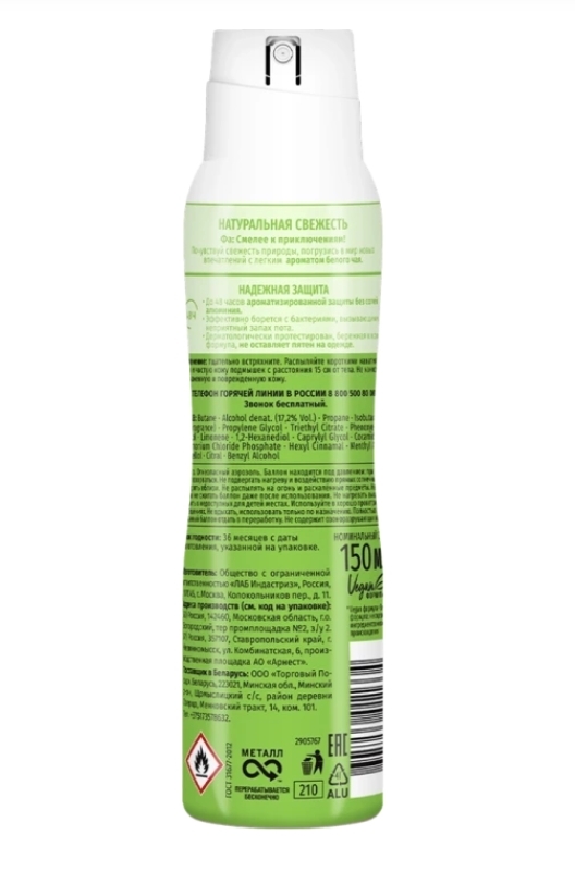 Дезодорант-антиперспирант спрей женский ФА Натуральная свежесть Белый чай ‒ побалуйте свои чувства вдохновляющими ароматами путешествий вместе с женским дезодорантом ФА. Почувствуйте защиту и фантастическое наслаждение каждый день. Свежий, как белый чай, легкий, как летний дождь. Ощути надежную защиту дезодоранта с легким ароматом белого чая, который мягко окутает тебя в течение дня. До 48 часов ароматизированной защиты без солей алюминия. Формула активной свежести эффективно борется с бактериями, вызывающими неприятный запах, обеспечивая длительную защиту. Дерматологически протестировано, бережная к коже формула, не оставляющая пятен на одежде. Состав: Dimethyl Ether, Alcohol denat. (37,0% Vol.), Aqua, Octylacrylamide/Acrylates/Butylaminoethyl Methacrylate Copolymer, AminomethylPropanol, Vinyl Caprolactam/VP/Dimethylaminoethyl Methacrylate Copolymer, Isopropyl Myristate, Triethyl Citrate, Panthenol,Benzophenone-4, Tocopheryl Acetate, Parfum, PEG/PPG-18/18 Dimethicone, Butylphenyl Methylpropional, Linalool, Coumarin.
