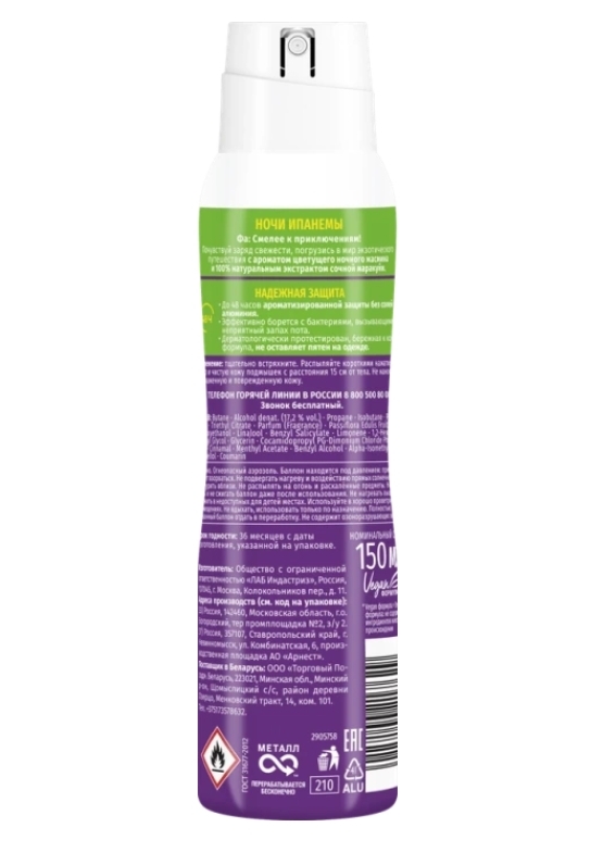 Дезодорант-спрей женский ФА Ритмы Бразилии Ночи Ипанемы ‒ смелее к приключениям! Почувствуйте заряд свежести, погрузись в мир экзотического путешествия с ароматом цветущего ночного жасмина и 100% натуральным экстрактом сочной маракуйи! Женский дезодорант и спрей для тела. До 48 часов ароматизированной защиты без солей алюминия. Эффективно борется с бактериями, вызывающими неприятный запах пота. Дерматологически протестирован, бережная к коже формула, с технологией против пятен. Веган формула: не содержит ингредиентов животного происхождения. Состав: Dimethyl Ether, Alcohol denat. (32,1% Volume), Aqua, Octylacrylamide/Acrylates/Butylaminoethyl Methacrylate Copolymer, AminomethylPropanol, Vinyl Caprolactam/VP/Dimethylaminoethyl Methacrylate Copolymer, Panthenol, Benzophenone-4, Tocopheryl Acetate, Parfum,Limonene, Linalool, Citronellol, Benzyl Alcohol, Alpha-Isomethyl Ionone.