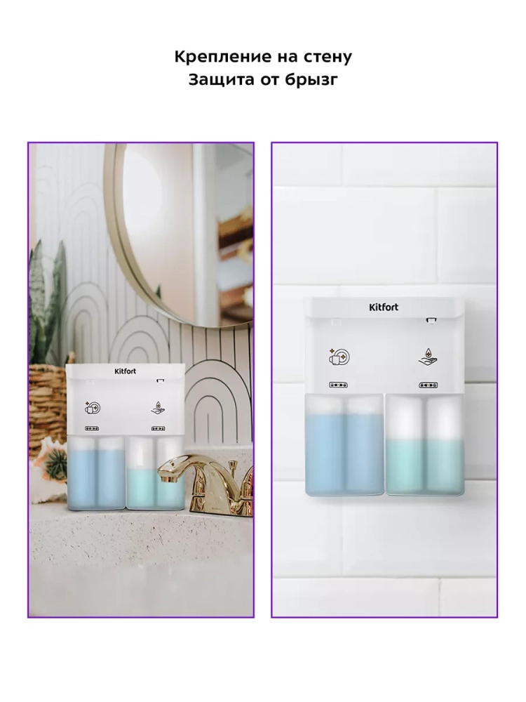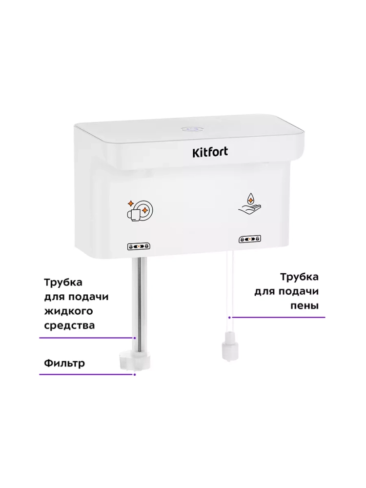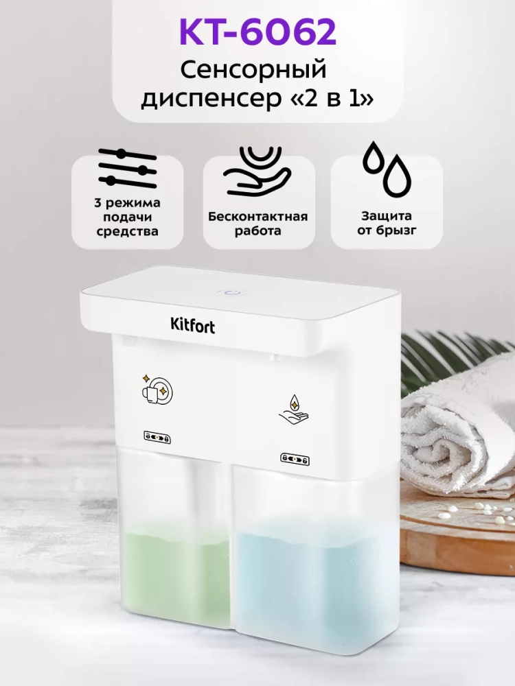 Сенсорный диспенсер «2 в 1» Kitfort КТ-6062 — устройство для порционной выдачи жидкого мыла, жидких моющих и некоторых негустых косметических средств, а также жидких средств в виде пены. Устройство оснащено двумя резервуарами и двойной системой подачи средства: мыло из одного резервуара подается в жидком виде, а из другого — в виде пены.