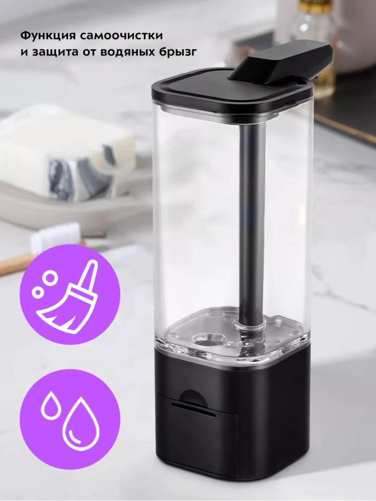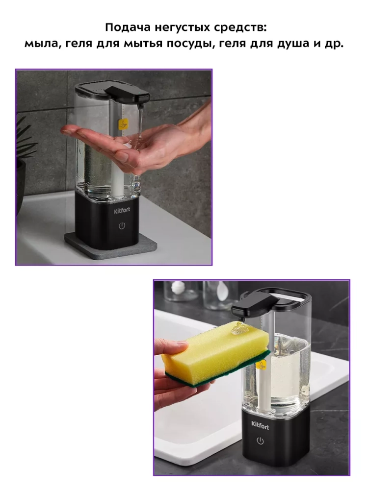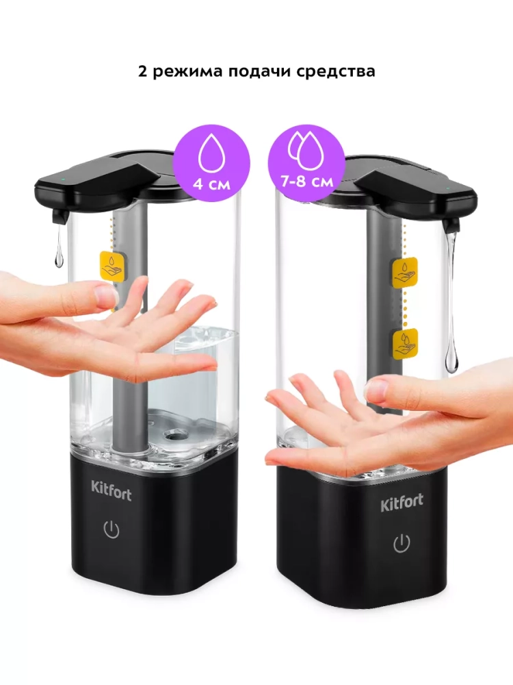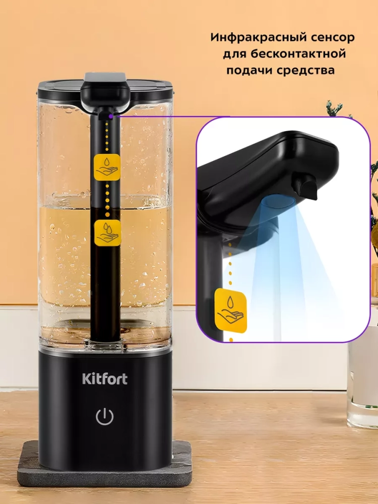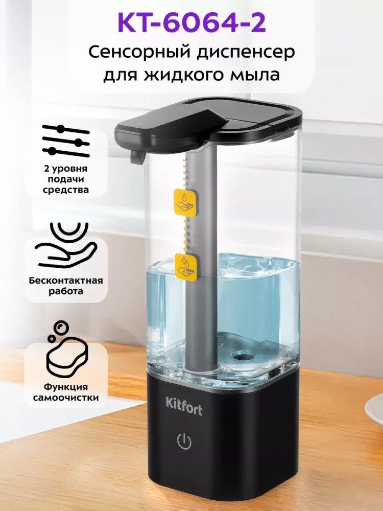 Сенсорный диспенсер Kitfort КТ-6064 — устройство для порционной выдачи жидкого мыла, жидких моющих и некоторых негустых косметических средств. У диспенсера два режима подачи средства: если вы поднесете руку ближе к носику прибора, диспенсер выдаст немного средства, если поднесете руку ниже, объем средства увеличится. Прозрачный резервуар позволяет отслеживать уровень жидкости в диспенсере. Диспенсер легко наполнять средством — необходимо просто снять крышку с резервуара и залить жидкость внутрь. Диспенсер оснащен инфракрасным сенсором, который реагирует на поднесение к нему руки, губки для мытья посуды или другого предмета. Использование сенсорного диспенсера (в отличие от механических моделей) считается более гигиеничным, так как не требует контакта с поверхностью устройства. У прибора есть функция самоочистки, что поможет вам легко удалить остатки средства из дозирующего механизма. Устройство работает от 4 батареек типоразмера АА × 1,5 В (в комплект не входят). Диспенсер будет полезен в ванной комнате или на кухне. Его можно использовать для подачи жидкого мыла, негустого крем-мыла, средства для мытья посуды, геля для душа или мицеллярной воды. Устройство оснащено защитой от водяных брызг, поэтому его можно устанавливать во влажном помещении. Диспенсер можно установить на стол, полку или раковину.