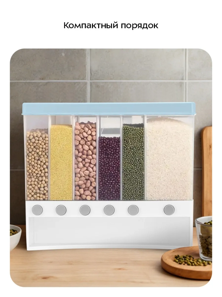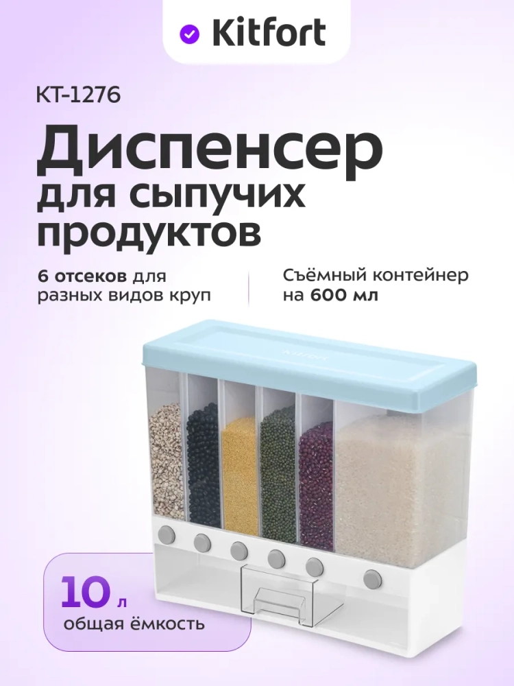 Диспенсер для сыпучих продуктов Kitfort КТ-1276 позволяет хранить в одном месте до 6 видов круп или бобовых. Емкость диспенсера — 10 л. Диспенсер сделан из пластика BPA-free, не содержит Бисфенол А, тем самым данный вид пластика безопасен для здоровья.
