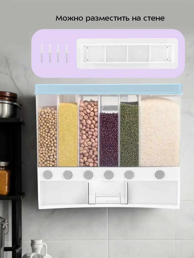 Диспансер для сыпучих продуктов занимает мало места и легко помещается на любой полке, в шкафу или столешнице. Диспенсер можно подвесить на стену, в комплекте идет кронштейн с крепежом.