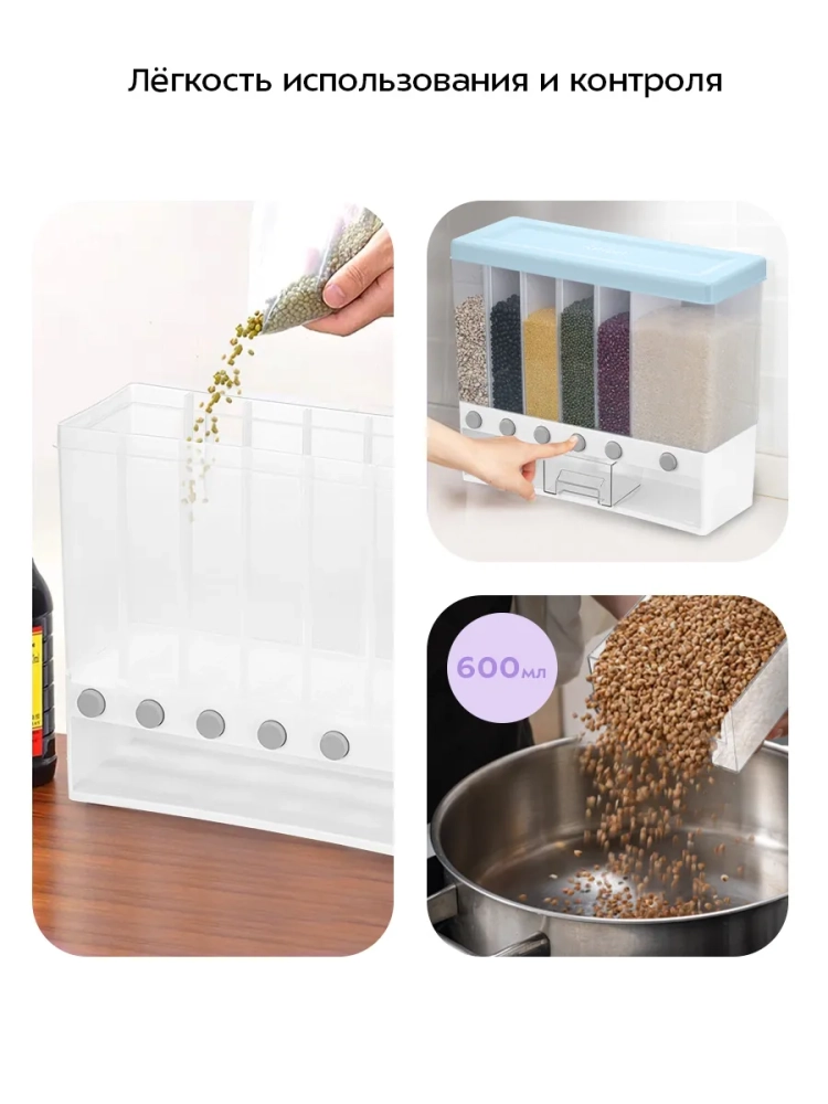 Чтобы высыпать нужный продукт, расположите съемный контейнер над отсеком с нужным продуктом, а затем нажмите на кнопку отсека, крупа будет высыпаться, пока вы удерживаете кнопку.