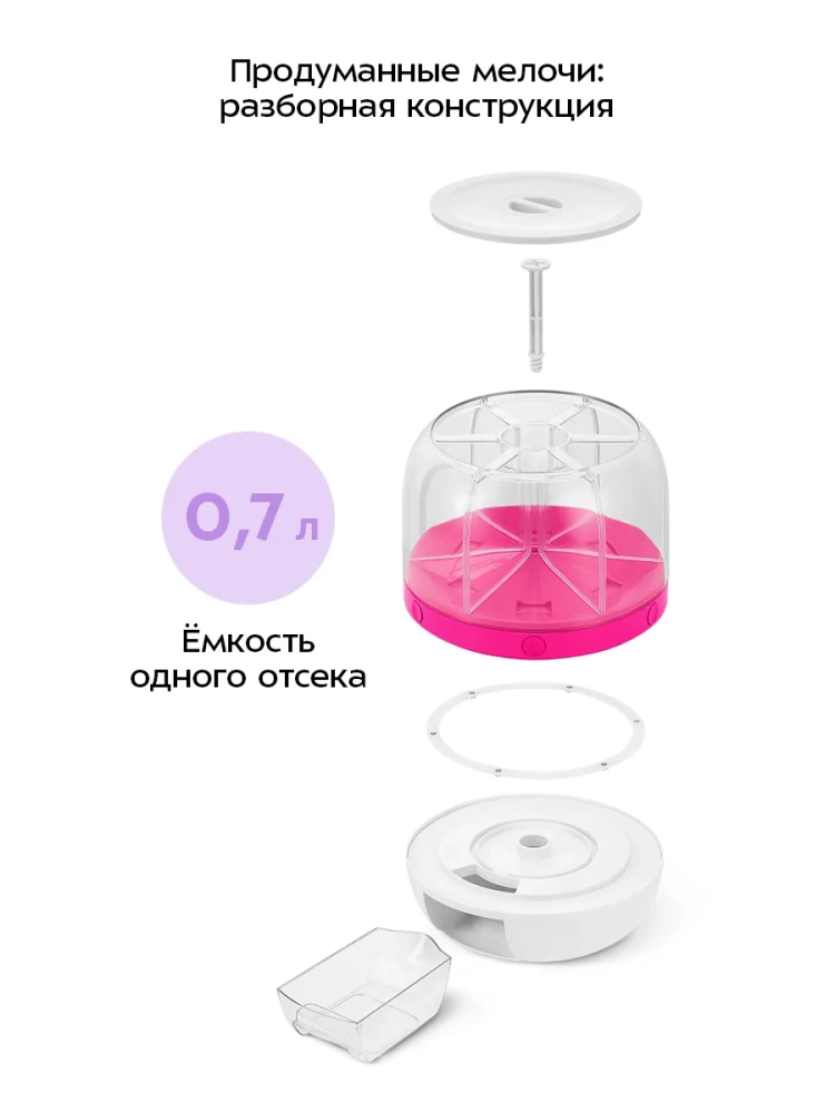 Устройство состоит из 6 прозрачных отсеков, крышки, подставки и съемного контейнера. У съемного контейнера есть удобный носик для высыпания. Под крышкой есть отсек для приправ, в который можно положить ароматные специи, например анис, что позволит предотвратить появление насекомых, которые иногда заводятся в крупах.
