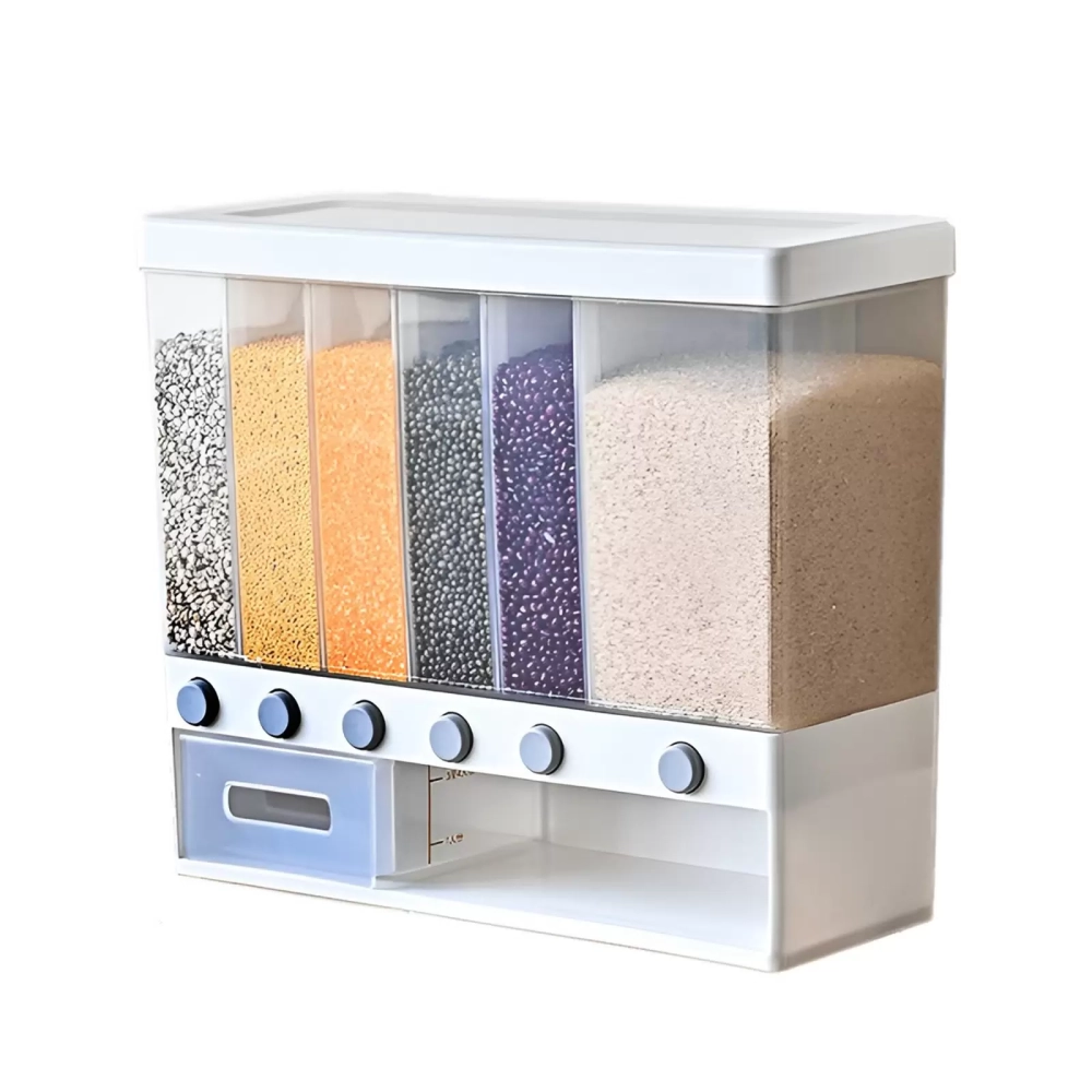 Кухонный диспенсер (шестисекционный) для различных сыпучих продуктов, таких как: крупы, различные хлопья и многое другое. Благодаря прозрачному корпусу, Вы всегда контролируете наполненность диспенсера. Диспенсер можно разместить как на столе, так и на стене и даже в шкафу. Изготовлен из экологически чистого полипропилена, нетоксичный, прочный. Сохраняет продукты сухими, защищает от насекомых. Диспенсер для круп прост в использовании, установите диспенсер в удобном месте, засыпьте продукты, и нажимая кнопку под нужным продуктом, он попадет в мерную емкость и вы сразу можете контролировать требуемый объем. Этот универсальный, удобный помощник на Вашей кухне предназначен для хранения сыпучих продуктов. Благодаря прозрачному корпусу Вы всегда сможете контролировать наполнение диспенсера. Данный органайзер для сыпучих продуктов не займёт много места на Вашей кухне. Вы с лёгкостью сможете разместить его на столе, стене или же в шкафу. Шестисекционный диспенсер прост в использовании. Установите дозатор в удобном Вам месте, засыпьте продукты по контейнерам и, нажимая кнопку под нужным продуктом, заполните мерную емкость, контролируя требуемый объём. Контейнеры из полимеров.Наведите порядок на полках раз и навсегда! Диспенсер для круп с 6 вместительными отсеками избавит вас от пластиковых упаковок и пакетов. В каждый из 6 отсеков можно поместить до 1 кг различных сыпучих продуктов, и они всегда будут у вас на виду. Рис, гречка и другие крупы - все это теперь будет под рукой! Диспенсер занимает мало места, его можно хранить практически на любой полке, в шкафу или на столешнице. Универсальный дизайн диспенсера идеально впишется в любую кухню! Стильные аксессуары для кухни всегда преображают ее. Мы уверены, что бесконечные банки с крупами - это прошлый век, и с помощью вращающегося органайзера для сыпучих продуктов можно избавиться от визуального шума. Кухонный гаджет оснащен 6 вместительными отсеками для сухих продуктов, а также мерным контейнером, кнопкой-дозатором и специальным контейнером для ароматического наполнения или специй. Диспенсер позволяет без труда отмерить необходимое количество ингредиентов, мерные стаканчики Вам больше не понадобятся. Готовить по рецептам с помощью дозатора для круп проще простого - отмерьте точное количество продукта всего с помощью одного нажатия. Емкость для круп с функцией вращения идеально подходит для хранения зерновых, а также крупяных и бобовых культур. Греча и рис, или кукуруза и пшеница, горох и чечевица, а также нут и булгур - расположите крупы в диспенсере и избавьтесь от пластиковых пакетов. Также в органайзере для дома и кухни удобно хранить макароны небольшого размера и мюсли. Кухонный инвентарь должен быть не только красивым, но и функциональным. Крутящаяся подставка поможет Вам найти необходимый отсек за секунды. Каждый отсек емкости для хранения круп вмещает в себя до 1 кг крупы (или целую пачку). Это позволит Вам избавиться от магазинных упаковок и навести порядок на кухонных полочках. Чистота и порядок на кухне - мечта каждой хозяйки, поэтому организация хранения на кухне так важна. Хранение круп требует особой внимательности, ведь от нарушений правильных условий в сухих продуктах могут завестись насекомые и даже плесень. Органайзер для продуктов имеет специальный контей