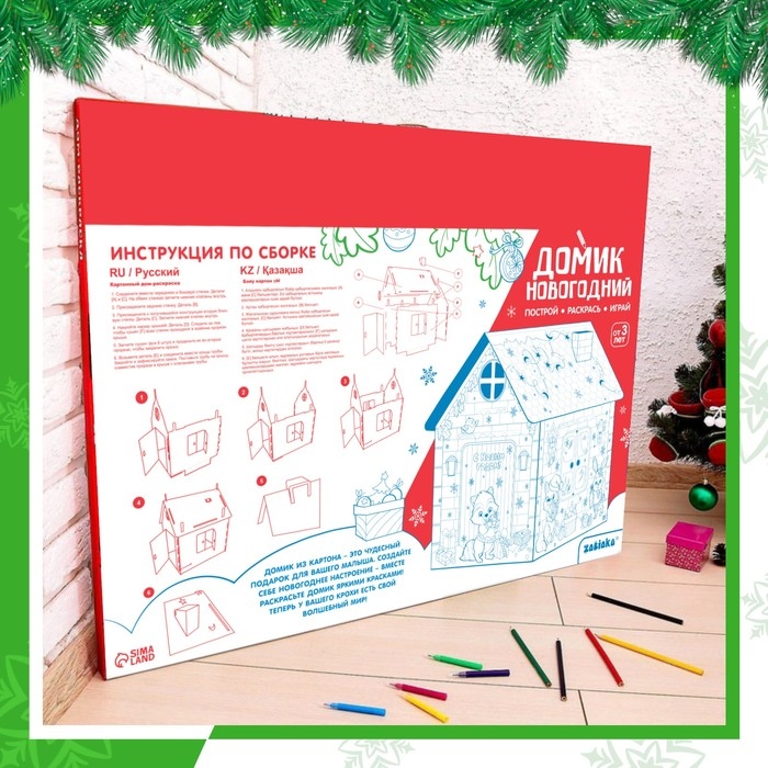 Новогодний домик из картона станет отличным подарком для ребёнка и любимым местом для его игр. Внутри малыш устроит себе уютный уголок, а снаружи раскрасит стены по собственному вкусу.
