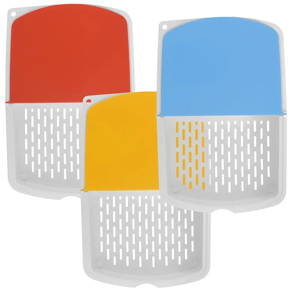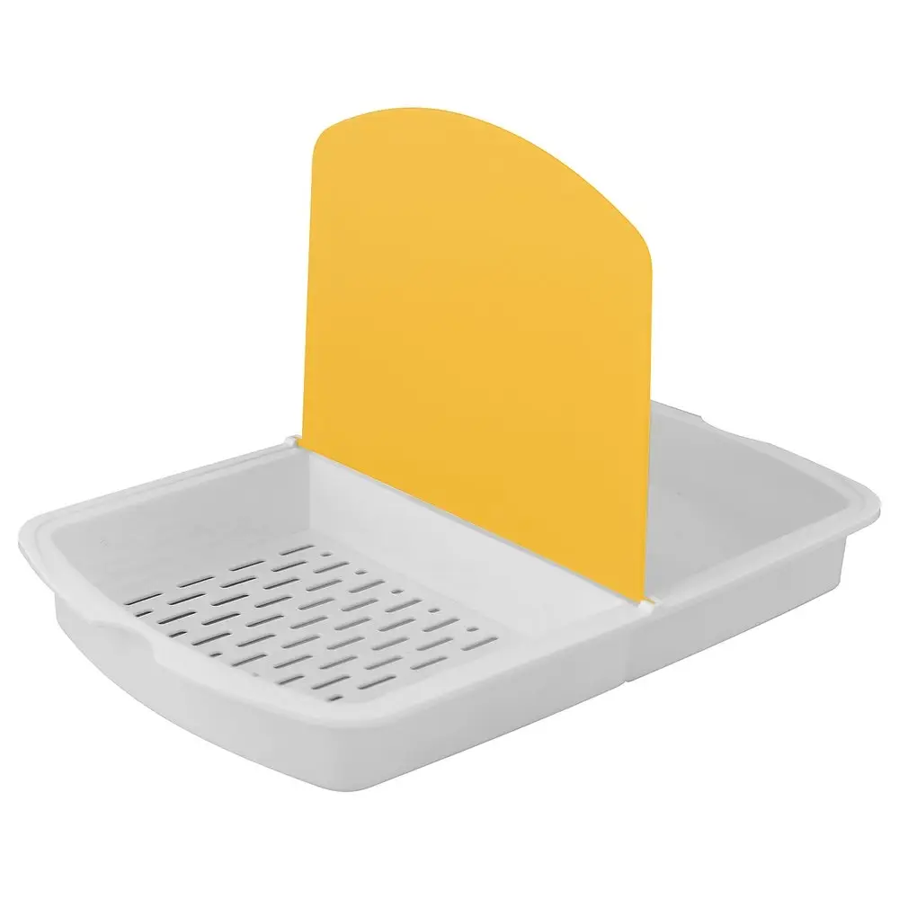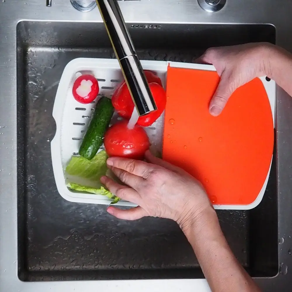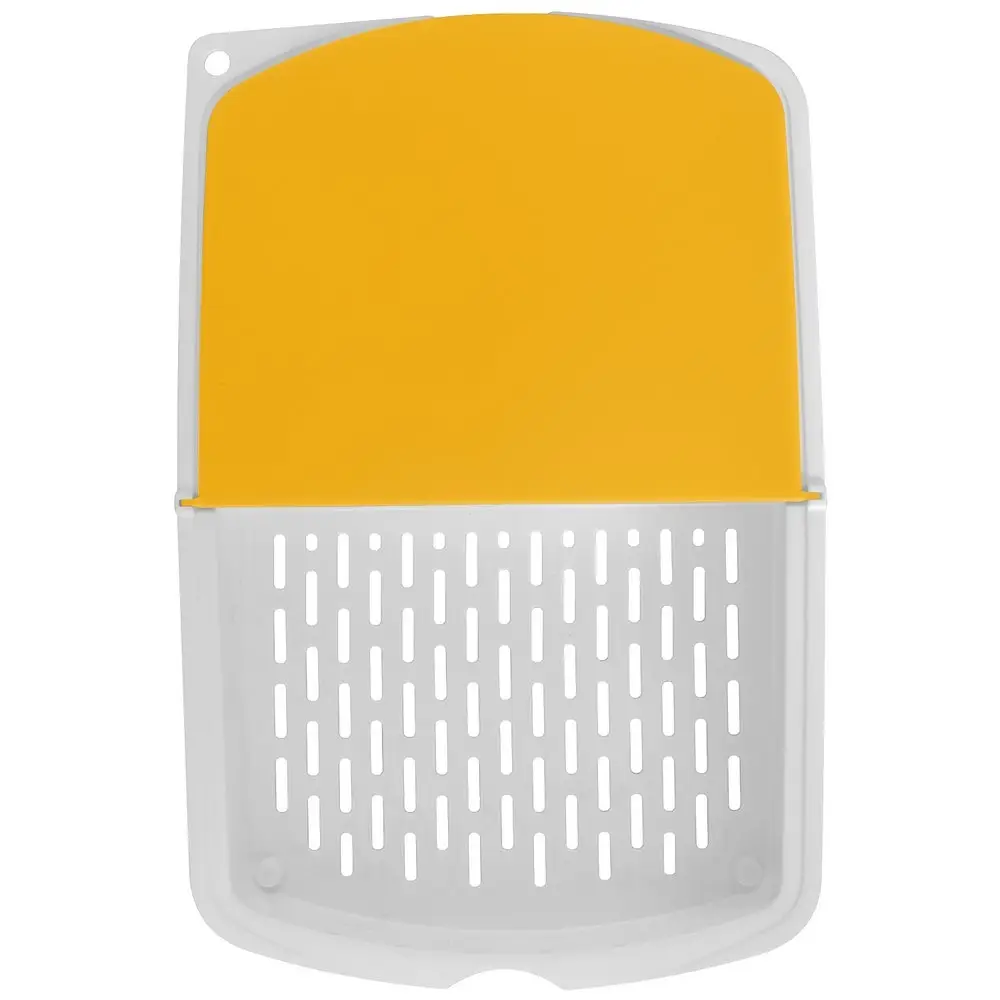 Перекидная разделочная доска имеет в основании поддон, разделенный на 2 секции, одна из которых выполняет функцию лотка для сбора нарезанных продуктов, а вторая используется в качестве дуршлага. Такая оригинальная конструкция изделия позволит вам комплексно решать задачи по обработке ингредиентов для приготовления блюда.