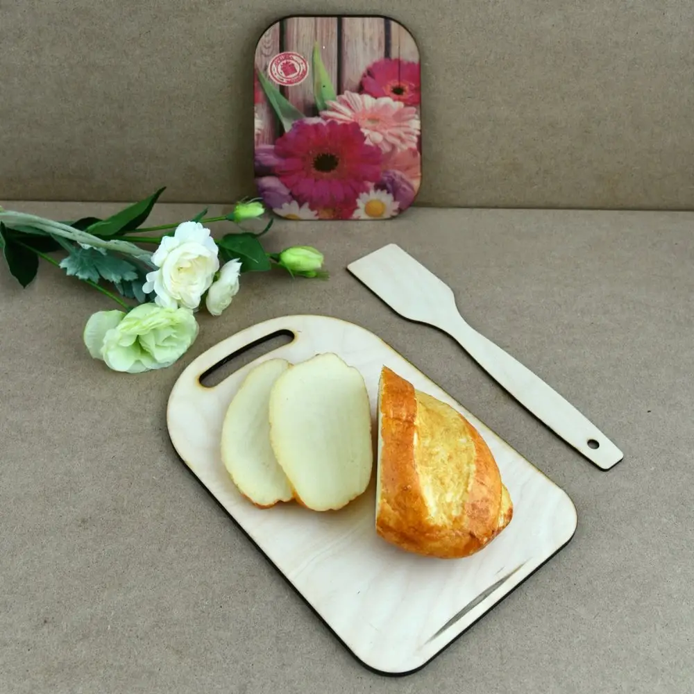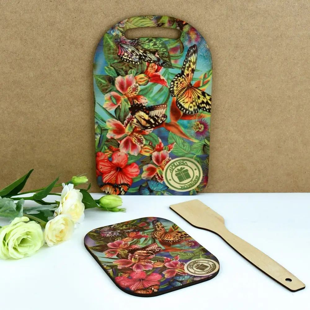 Декорированная, с одной стороны, доска может стать прекрасным подарком и достойным украшением интерьера кухни, столовой, гостиной. Подставка предназначена для защиты поверхности стола от пятен, царапин и обладает термоизолирующим свойством. Лопатка незаменима для перемешивания и переворачивания готовящихся блюд.