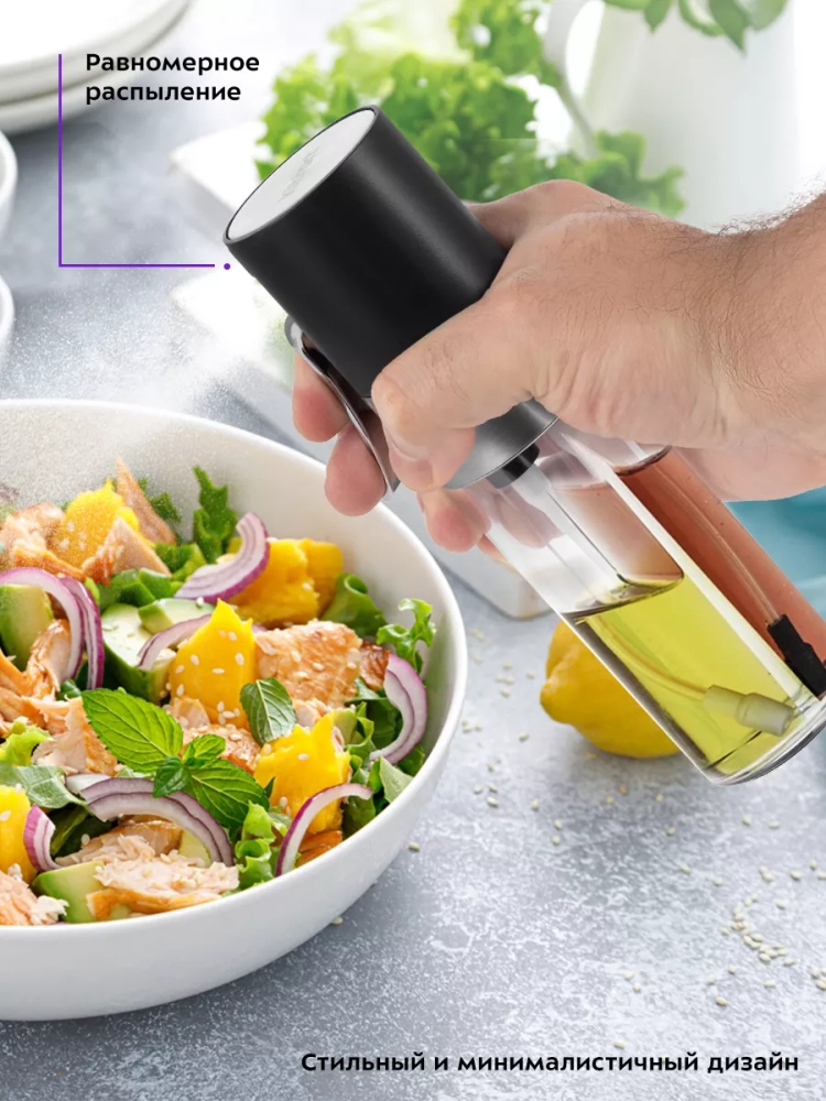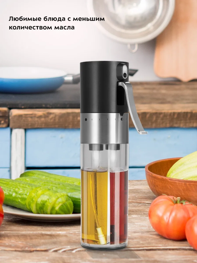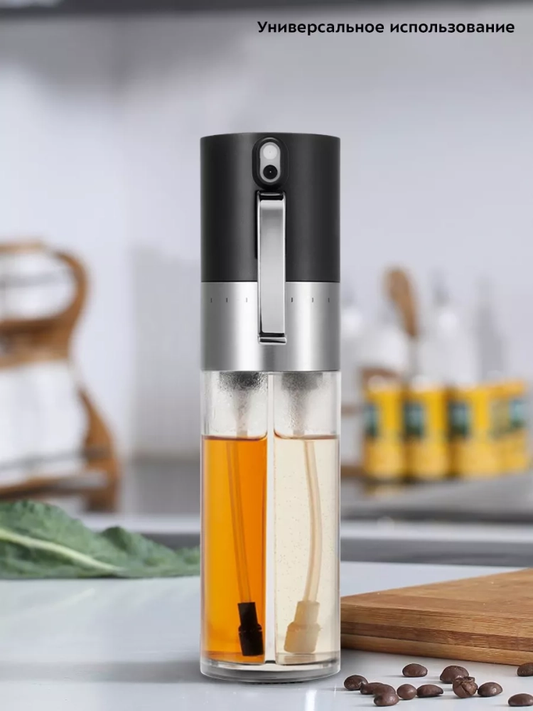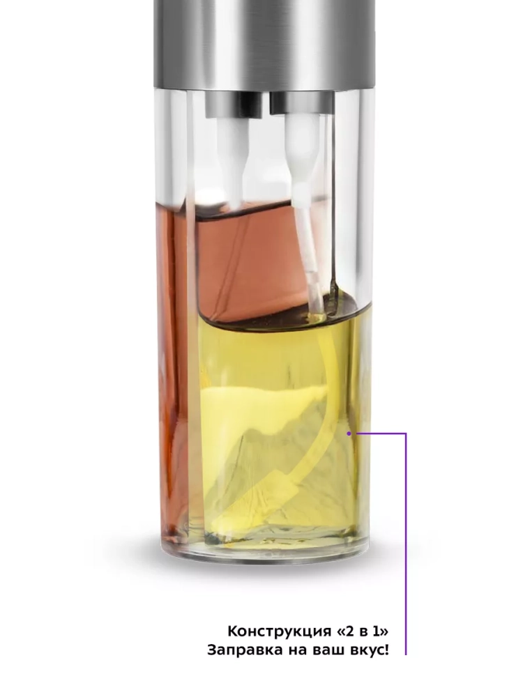 Устройство имеет конструкцию «2 в 1»: корпус разделен на два резервуара. Такая конструкция позволит сохранить больше свободного пространства на вашей кухне. Также благодаря конструкции «2 в 1» вы можете добавлять масло и уксус в блюдо одновременно, таким образом смешивая их. Вы можете настроить количество масла и уксуса, которое хотите смешать.