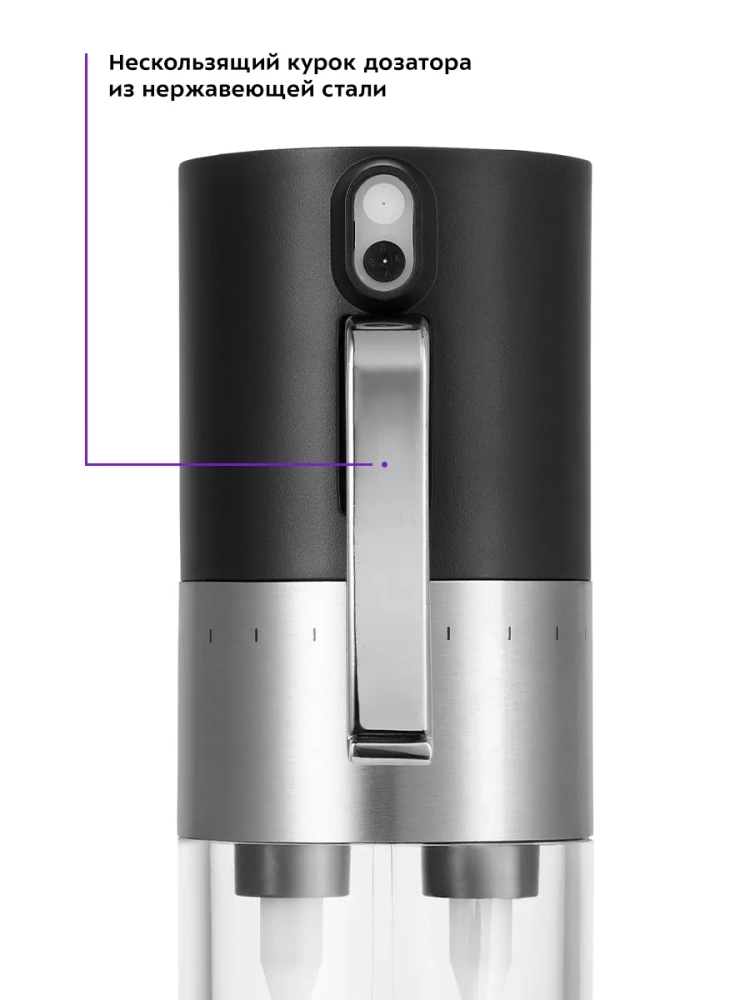 Дозатор выполнен из пластика с декоративной вставкой из нержавеющей стали. Корпус прозрачный, что позволяет следить за количеством содержимого в резервуарах.