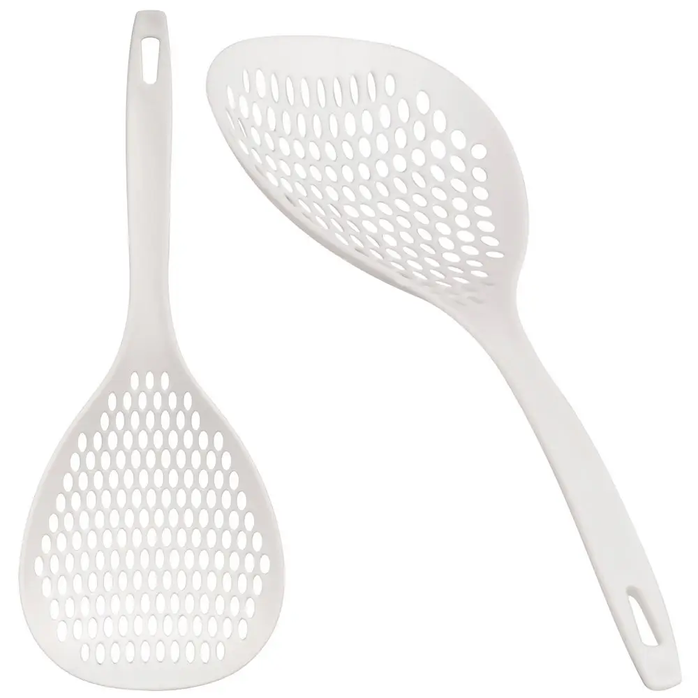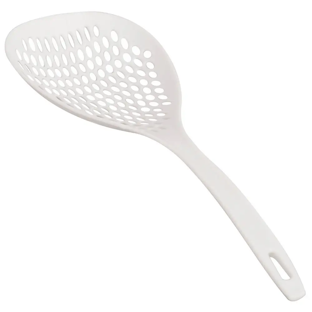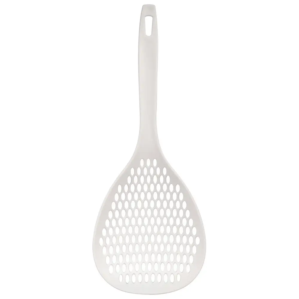 Дуршлаг-шумовка используется для извлечения овощей, мяса, рыбы, пельменей и вареников из бульона, ягод из компота, отварных яиц, морепродуктов из горячей воды. Благодаря большому размеру, прибор можно использовать как дуршлаг для сливая через него жидкостей. Подойдет для мытья фруктов и мелких овощей, для откидывания вареных макарон. На обратной стороне ручки имеется ограничитель, который не позволит шумовке сползти в кастрюлю. Изготовлено из пластмассы (полипропилен). Размер: 13х34 см.