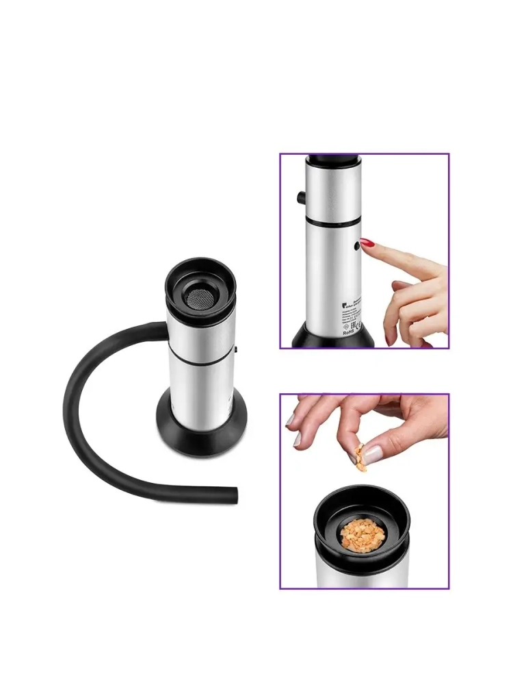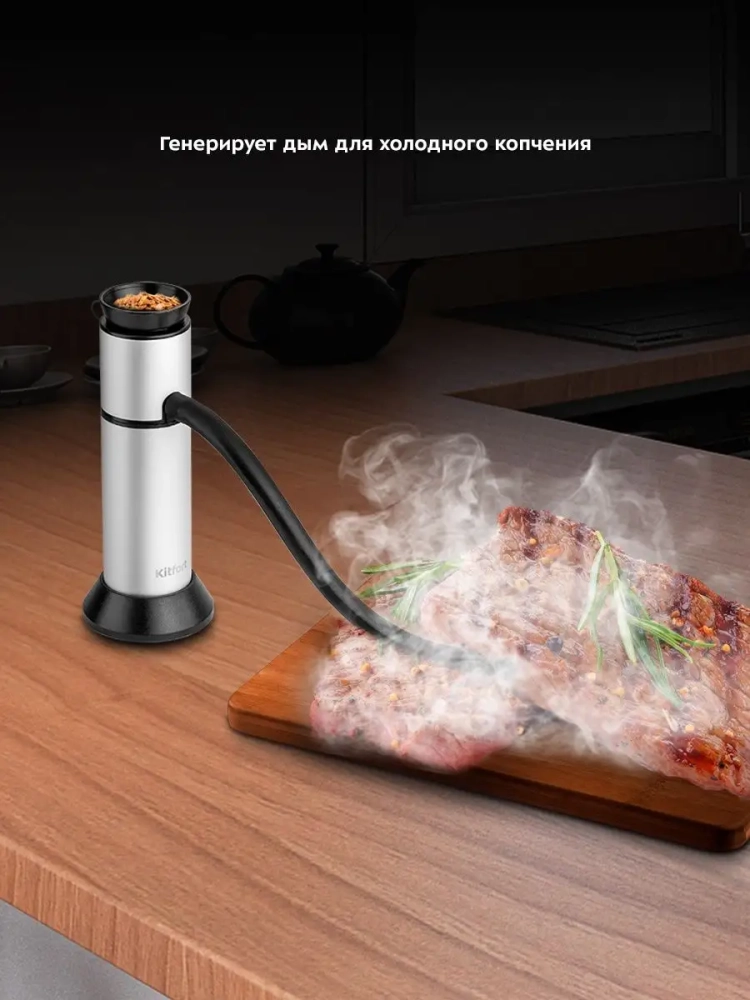 Дымогенератор для копчения Kitfort КТ-4024 предназначен для окуривания продуктов холодным дымом и получения вкуса и аромата копченых на костре продуктов. Благодаря компактной конструкции, малому весу, съемным элементам питания и общей простоте использования, вы можете взять дымогенератор с собой куда угодно и за считанные минуты придать любому блюду или напитку аромат и вкус «дымка». Дымогенератор устойчиво стоит на столе, а эластичная коптильная трубка длиной 25 см позволяет окуривать продукты в любой посуде. Вы можете разместить дымогенератор на столе и окуривать блюдо в тарелке, кастрюле, пакете, стакане, под крышкой клош и даже в блендере при приготовлении коктейлей. Дымогенератор очень прост в использовании — управление устройством осуществляется единственной кнопкой. Все что вам нужно, чтобы придать блюду аромат и вкус копчения, это разжечь щепу и при помощи трубки дымогенератора направить струю холодного дыма на продукты. Камера сгорания выполнена из алюминия, эластичная коптильная трубка — из силикона. Камера сгорания и отсек для щепы съемные, что позволяет легко очищать устройство от нагара и осевшей смолы. Питание осуществляется от 2 батареек типа АА х 1,5 В (в комплект не входят). Это позволяет использовать дымогенератор без привязки к розеткам или другим источникам питания. Вы можете брать дымогенератор с собой на дачу, в поход, в гости и в любое место, где вы хотите получить продукты с ароматом и вкусом копчения на костре.