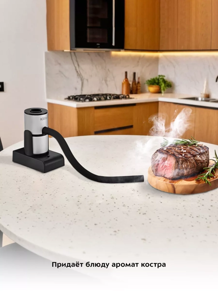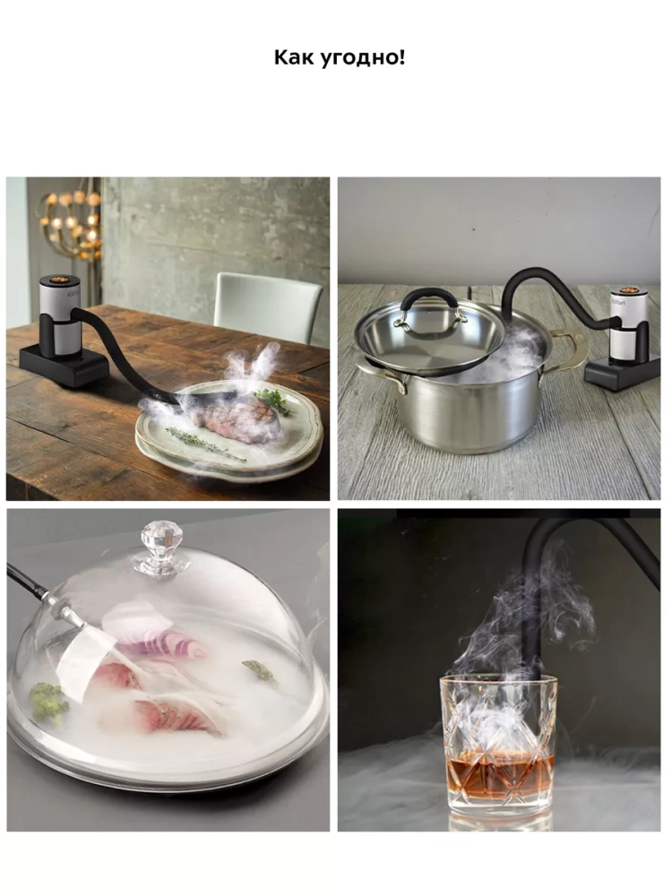 Благодаря широкому основанию дымогенератор устойчиво стоит на столе, а эластичная коптильная трубка позволяет окуривать продукты в любой посуде. Вы можете разместить дымогенератор на столе и окуривать блюдо в тарелке, кастрюле, пакете, стакане, под крышкой клош и даже в блендере при приготовлении коктейлей.