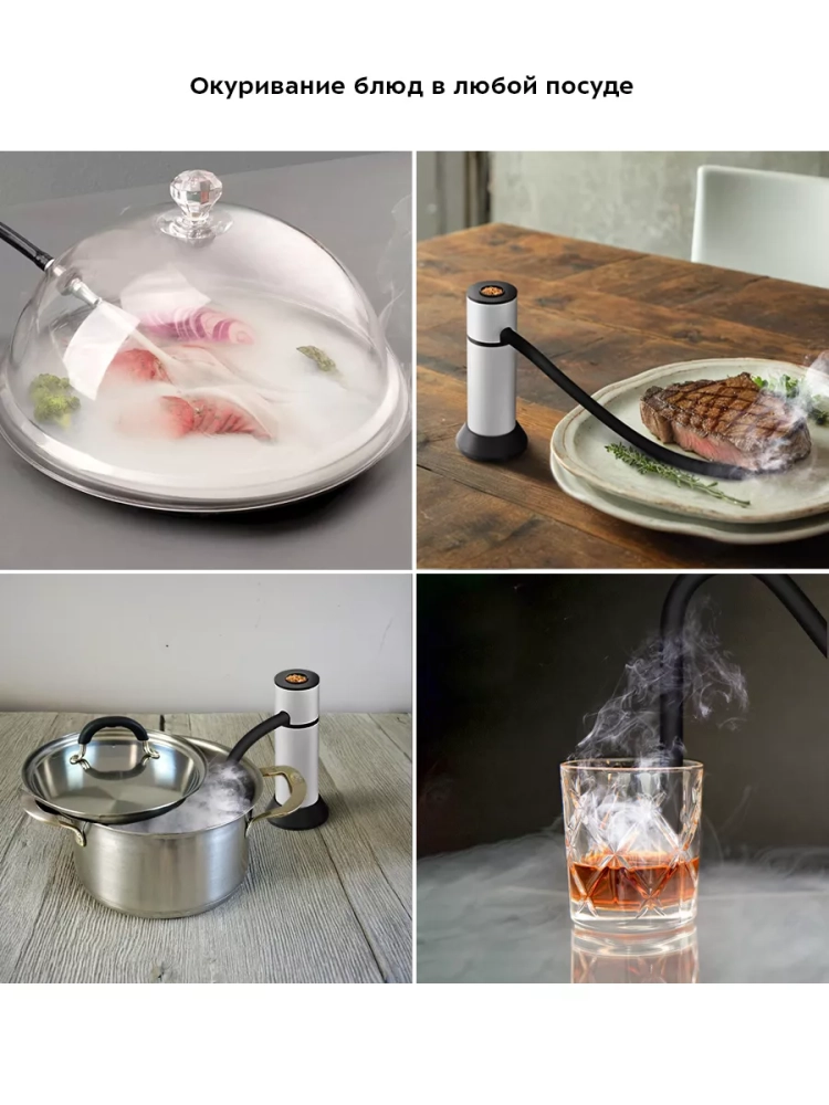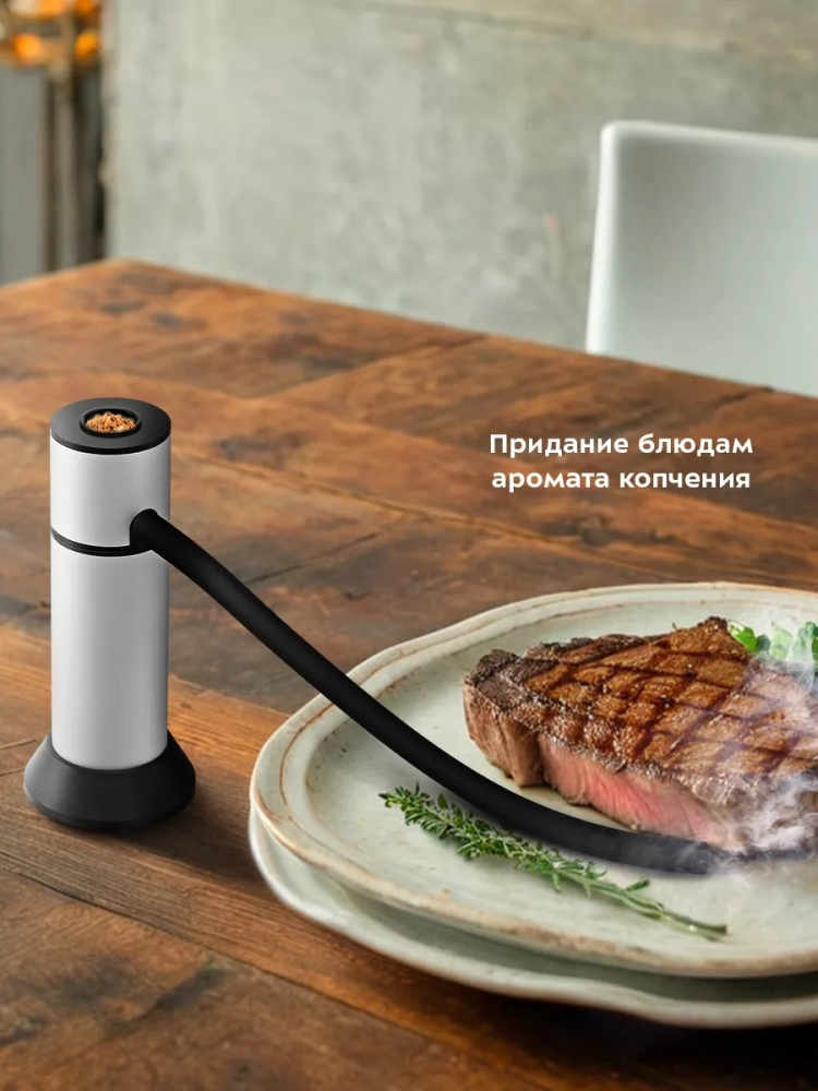 Благодаря широкому основанию дымогенератор устойчиво стоит на столе, а эластичная коптильная трубка позволяет окуривать продукты в любой посуде. Вы можете разместить дымогенератор на столе и окуривать блюдо в тарелке, кастрюле, пакете, стакане, под крышкой клош и даже в блендере при приготовлении коктейлей.