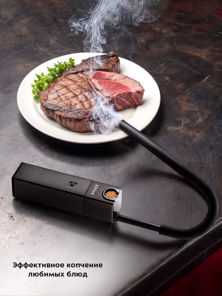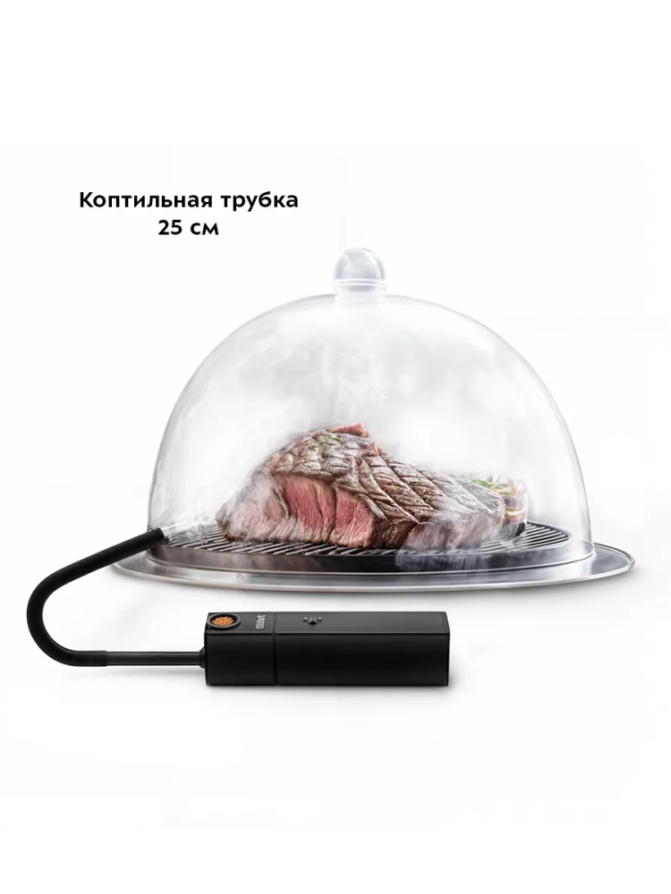 Благодаря широкому основанию дымогенератор устойчиво стоит на столе, а эластичная коптильная трубка позволяет окуривать продукты в любой посуде. Вы можете разместить дымогенератор на столе и окуривать блюдо в тарелке, кастрюле, пакете, стакане, под крышкой клош и даже в блендере при приготовлении коктейлей.