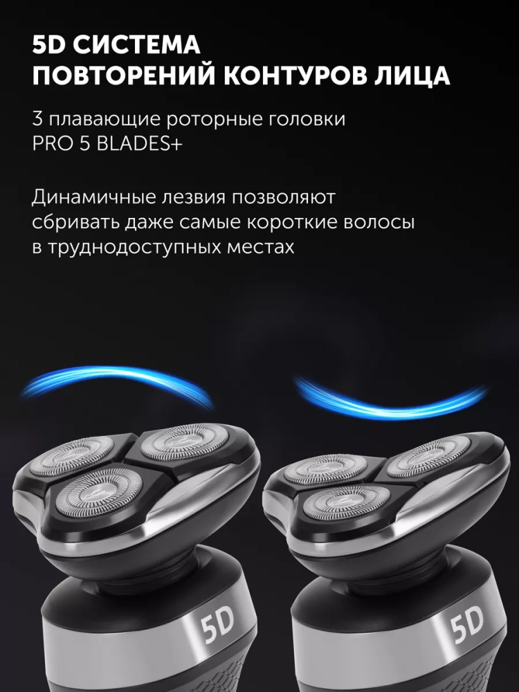 Портативное устройство оснащено 3-мя плавающими роторными головками PRO 5 BLADES с высокоточными двойными лезвиями, которые гарантируют аккуратное удаление волос без раздражения. Супергладкие кольца и ножи из нержавеющей стали минимизируют трение. Влагозащищенный корпус позволяет использовать бритвенную машинку для сухого и влажного бритья с использованием пены или геля, а также в душе. Инструмент сочетает мощность профессиональной техники для красоты и здоровья с удобством бытового прибора.