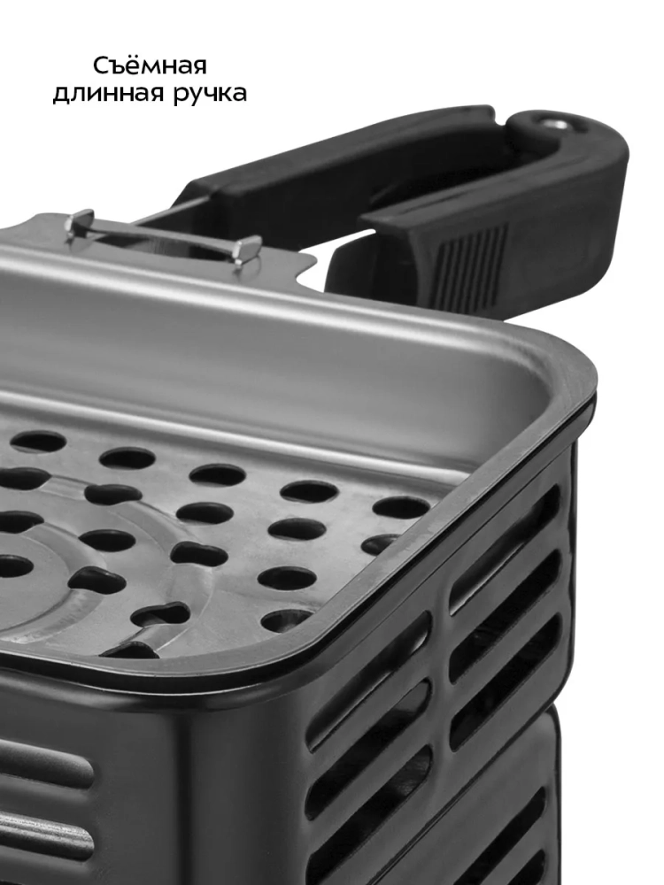 Ручка плиты длинная. Она не нагревается, а для удобства хранения ее можно снять. Ручку можно крепить как самой плите для розжига углей для кальяна, так и к корзине для углей. Корзина для углей съемная, поэтому вы можете по окончании разогрева углей снять ее и перенести ближе к кальяну.
