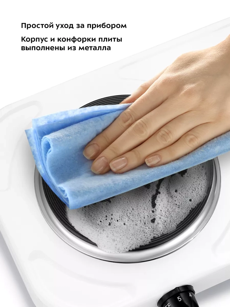Корпус и конфорки плиты выполнены из металла, благодаря этому плиту легко очистить от загрязнений.