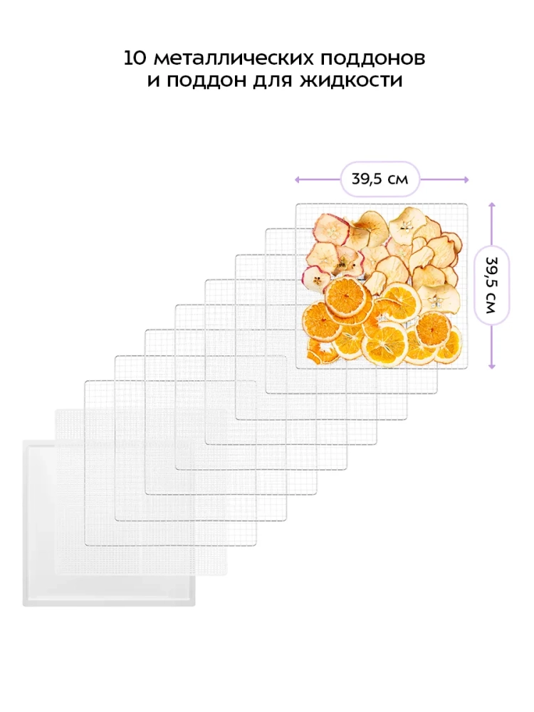 Электрическая сушилка Kitfort КТ-1910 — это идеальное решение для тех, кто хочет сохранить свежесть и вкус своих продуктов. Эта мощная электросушилка предназначена для сушки овощей, фруктов, ягод, грибов, мяса и других продуктов. С помощью этой сушилки вы сможете легко приготовить пастилу благодаря специальному поддону для жидкости. В комплект входят 10 поддонов из нержавеющей стали и 10 сеток для мелких продуктов, что позволяет одновременно обрабатывать большое количество ингредиентов. Сушилка оснащена мощным нагревательным элементом и вентилятором большого диаметра, который обеспечивает равномерное распределение горячего воздуха по всей камере. Это гарантирует качественную сушку без смешения запахов даже при одновременной обработке различных видов продуктов. Температура сушки регулируется в диапазоне от 35 до 75 градусов Цельсия с шагом в 5 градусов, что позволяет точно настроить процесс под каждый тип продукта. Таймер настраивается до 24 часов работы с шагом в полчаса — это удобно для длительной обработки больших партий овощей или фруктов. Дегидратор Kitfort КТ-1910 станет незаменимым помощником на вашей кухне благодаря своей универсальности и простоте использования. Эта овощесушилка подходит не только для домашних условий: она также может использоваться профессионалами в кулинарии или теми, кто занимается заготовками на продажу. Поддон из нержавеющей стали обеспечивает долговечность устройства даже при интенсивной эксплуатации. Сетка помогает эффективно высушивать мелкие продукты без риска их выпадения через крупные отверстия стандартных поддонов. Электросушилка Kitfort КТ-1910 — это надежный дигидратор как для любителей здорового питания, так и профессионалов.