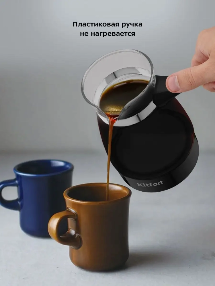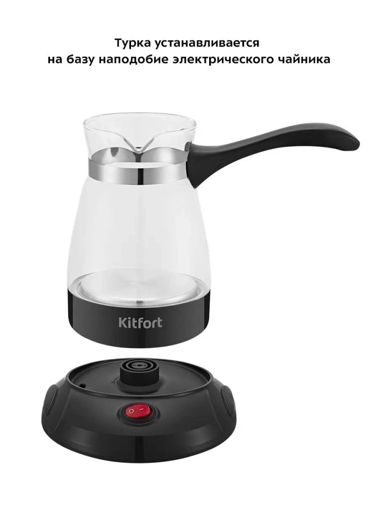 Электрическая турка Kitfort КТ-7132 варит кофе по-турецки. С ней вы сможете быстро и легко сварить натуральный кофе на 7 чашек по 60 мл. Устройство состоит из базы и турки.