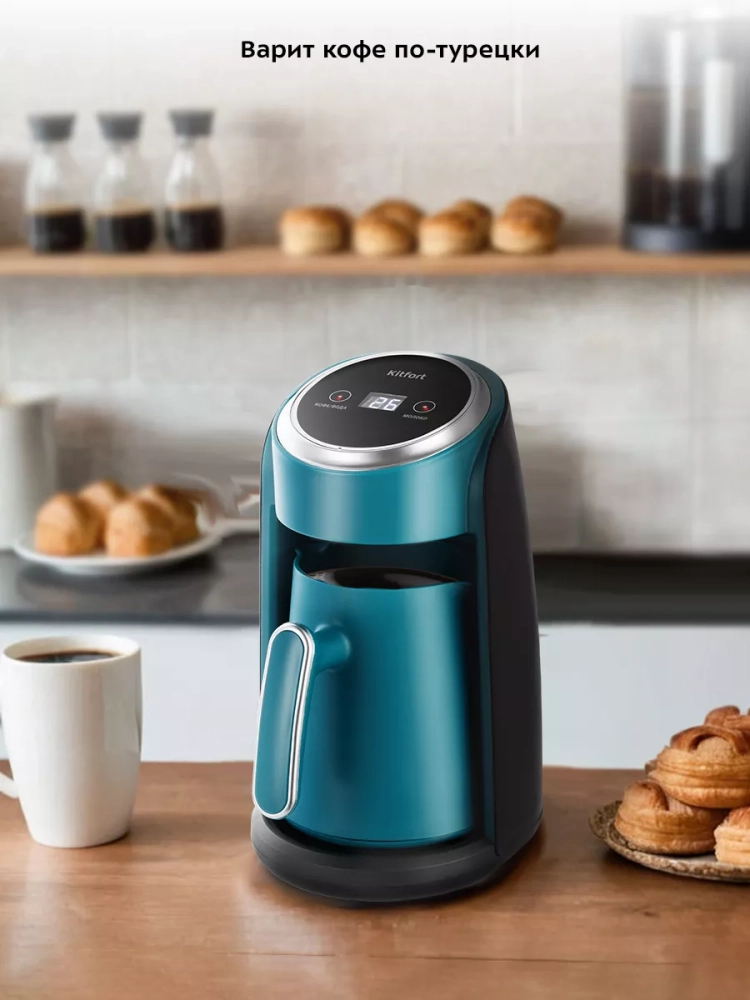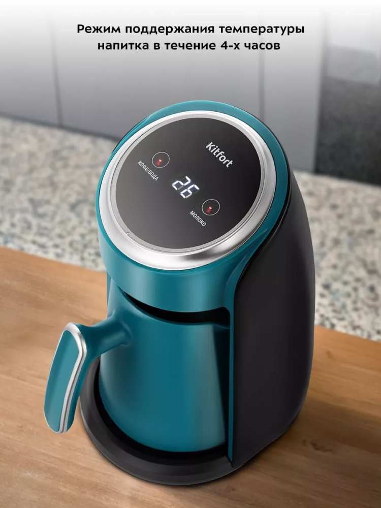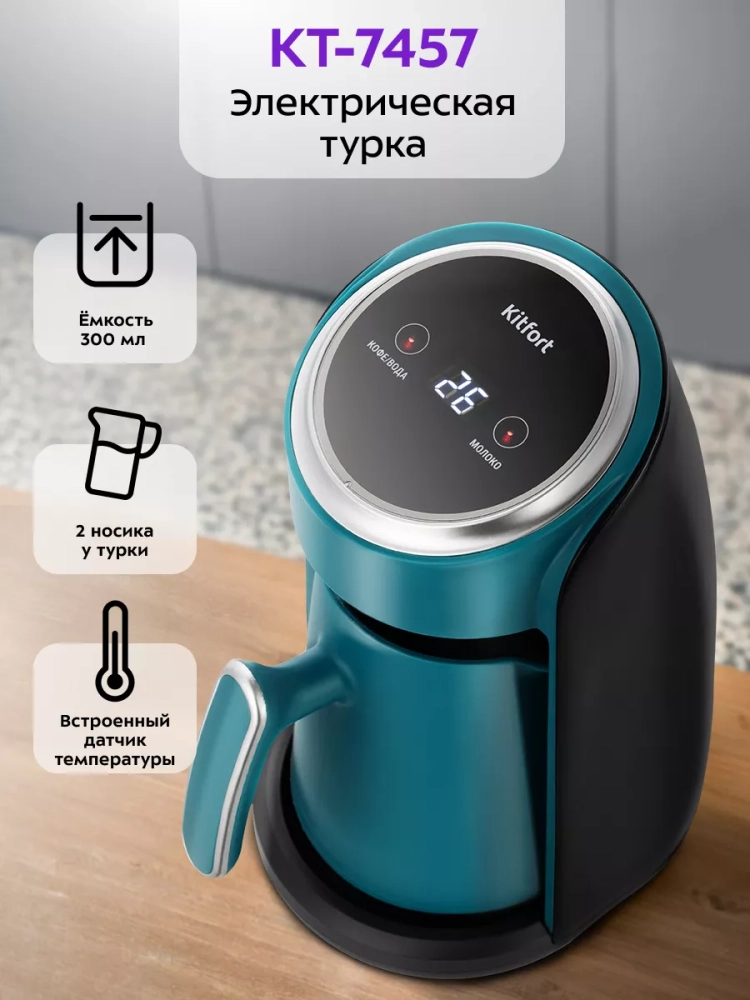 Электрическая турка Kitfort КТ-7457 варит кофе по-турецки. С ней вы сможете быстро и легко сварить натуральный кофе на 4 чашки по 60 мл. Также с помощью турки вы можете вскипятить воду или подогреть молоко.